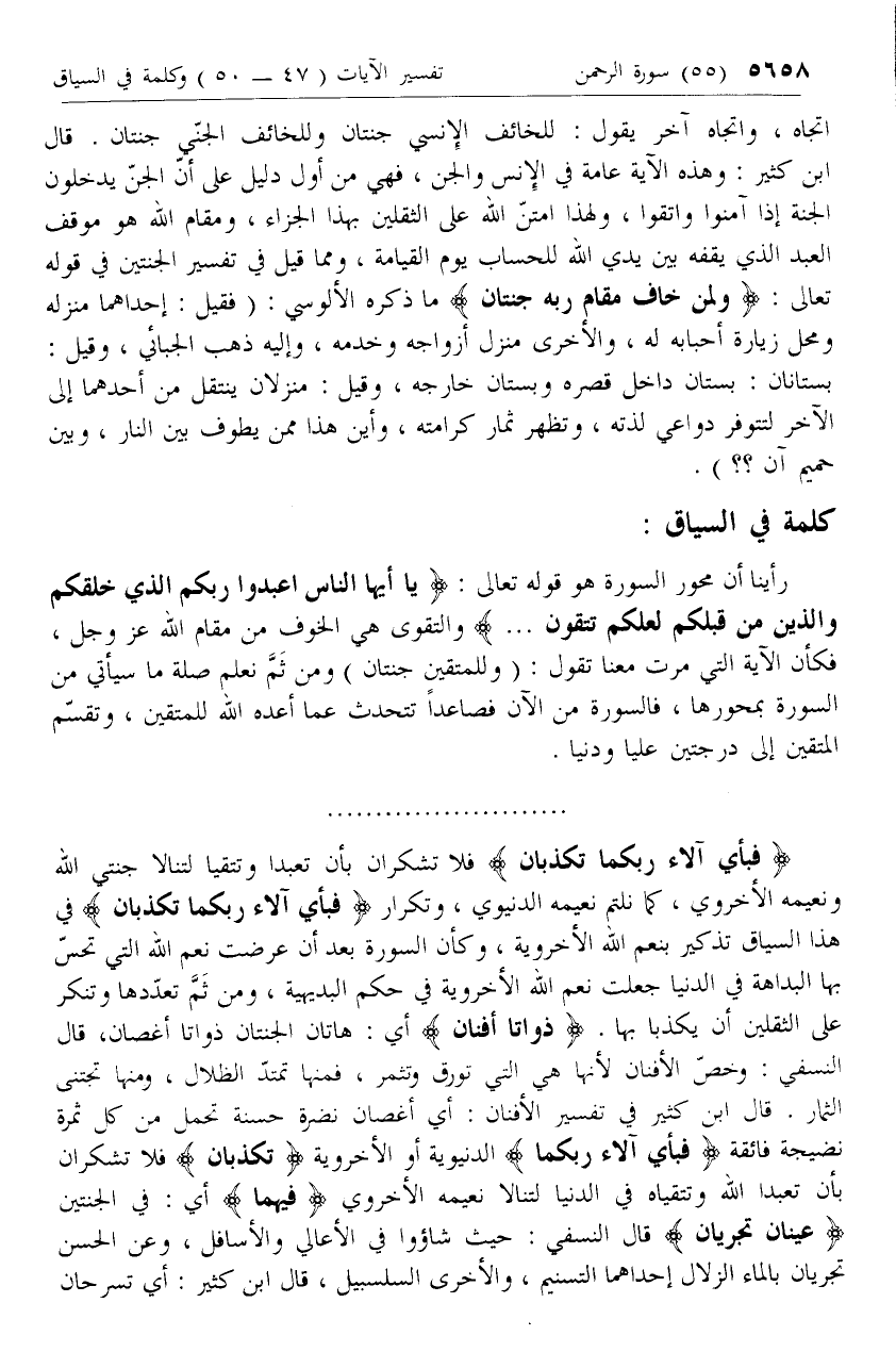فَبِأَيِّ آلاءِ رَبِّكُما تُكَذِّبانِ فلا تشكران بأن تعبدا وتتقيا لتنالا جنتي الله ونعيمه الأخروي، كما نلتم نعيمه الدنيوي، وتكرار فَبِأَيِّ آلاءِ رَبِّكُما تُكَذِّبانِ في هذا السياق تذكير بنعم الله الأخروية، وكأن السورة بعد أن عرضت نعم الله التي تحس بها البداهة في الدنيا جعلت نعم الله الأخروية في حكم البديهية، ومن ثم تعددها وتنكر على الثقلين أن يكذبا بها.