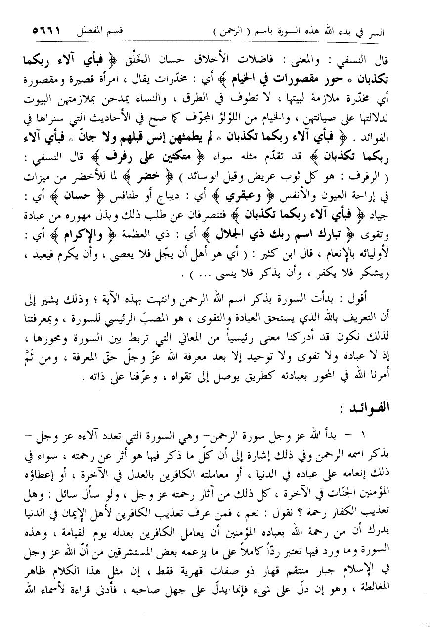 1 - بدأ الله عزّ وجل سورة الرحمن- وهي السورة التي تعدد آلاءه عزّ وجل- بذكر اسمه الرحمن وفي ذلك إشارة إلى أن كل ما ذكر فيها هو أثر عن رحمته، سواء في ذلك إنعامه على عباده في الدنيا، أو معاملته الكافرين بالعدل في الآخرة، أو إعطاؤه المؤمنين الجنات في الآخرة، كل ذلك من آثار رحمته عزّ وجل، ولو سأل سائل: وهل تعذيب الكفار رحمة؟ نقول: نعم، فمن عرف تعذيب الكافرين لأهل الإيمان في الدنيا يدرك أن من رحمة الله بعباده المؤمنين أن يعامل الكافرين بعدله يوم القيامة، وهذه السورة وما ورد فيها تعتبر ردا كاملا على ما يزعمه بعض المستشرقين من أن الله عزّ وجل في الإسلام جبار منتقم قهار ذو صفات قهرية فقط، إن مثل هذا الكلام ظاهر المغالطة، وهو إن دل على شئ فإنما يدل على جهل صاحبه، فأدنى قراءة لأسماء الله