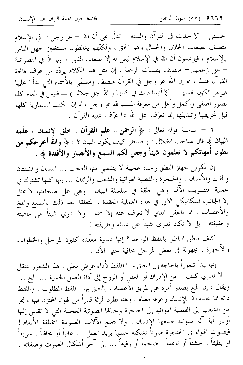 2 - بمناسبة قوله تعالى: الرَّحْمنُ* عَلَّمَ الْقُرْآنَ* خَلَقَ الْإِنْسانَ* عَلَّمَهُ الْبَيانَ قال صاحب الظلال: (فلننظر كيف يكون البيان؟: وَاللَّهُ أَخْرَجَكُمْ مِنْ بُطُونِ أُمَّهاتِكُمْ لا تَعْلَمُونَ شَيْئاً وَجَعَلَ لَكُمُ السَّمْعَ وَالْأَبْصارَ وَالْأَفْئِدَةَ.