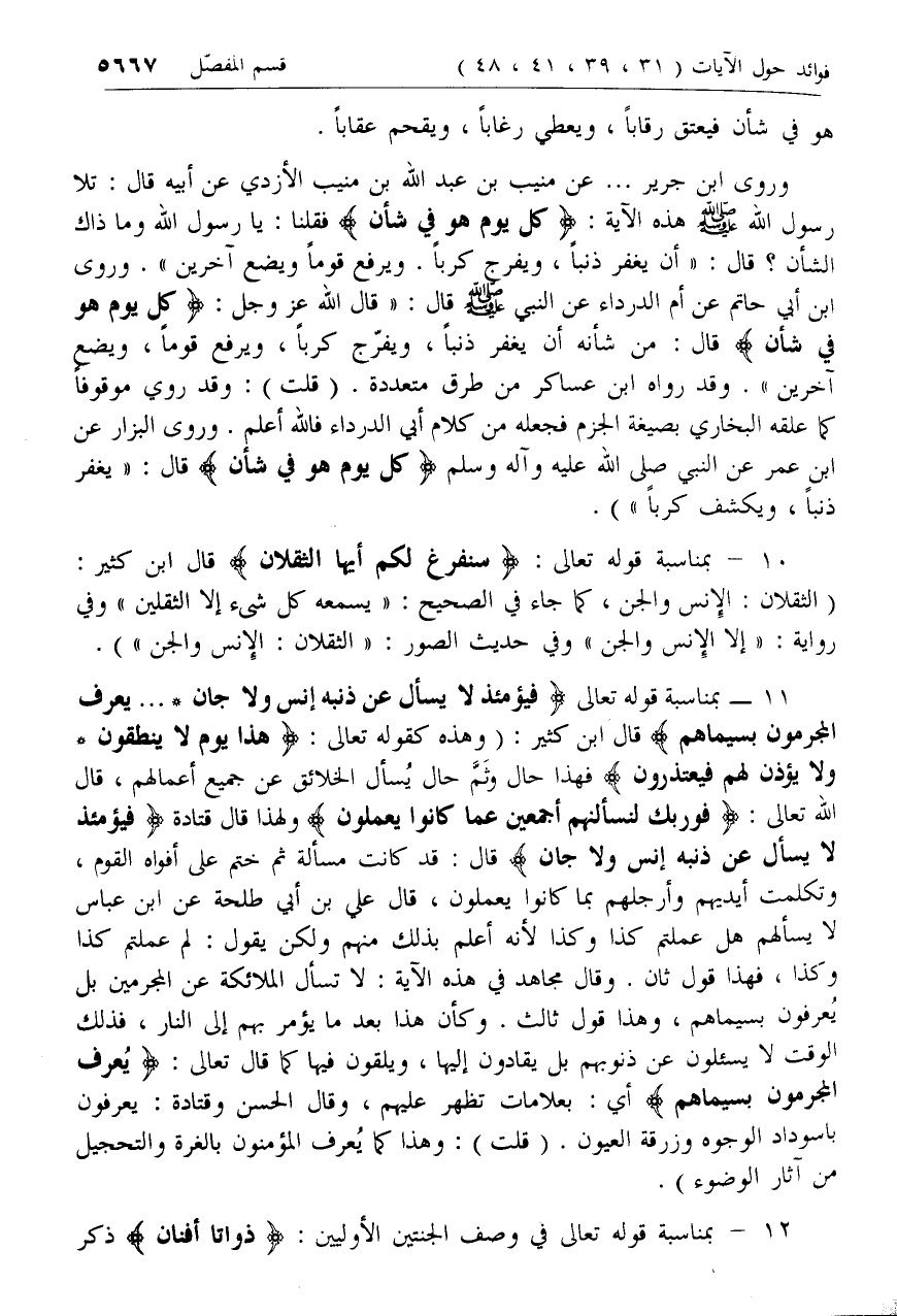 11 - بمناسبة قوله تعالى فَيَوْمَئِذٍ لا يُسْئَلُ عَنْ ذَنْبِهِ إِنْسٌ وَلا جَانٌّ* ... يُعْرَفُ الْمُجْرِمُونَ بِسِيماهُمْ قال ابن كثير: (وهذه كقوله تعالى: هذا يَوْمُ لا يَنْطِقُونَ* وَلا يُؤْذَنُ لَهُمْ فَيَعْتَذِرُونَ فهذا حال وثم حال يسأل الخلائق عن جميع أعمالهم، قال الله تعالى: فَوَ رَبِّكَ لَنَسْئَلَنَّهُمْ أَجْمَعِينَ عَمَّا كانُوا يَعْمَلُونَ ولهذا قال قتادة فَيَوْمَئِذٍ لا يُسْئَلُ عَنْ ذَنْبِهِ إِنْسٌ وَلا جَانٌّ قال: قد كانت مسألة ثم ختم على أفواه القوم، وتكلمت أيديهم وأرجلهم بما كانوا يعملون، قال علي بن أبي طلحة عن ابن عباس لا يسألهم هل عملتم كذا وكذا لأنه أعلم بذلك منهم ولكن يقول: لم عملتم كذا وكذا، فهذا قول ثان. وقال مجاهد في هذه الآية: لا تسأل الملائكة عن المجرمين بل يعرفون بسيماهم، وهذا قول ثالث. وكأن هذا بعد ما يؤمر بهم إلى النار، فذلك الوقت لا يسألون عن ذنوبهم بل يقادون إليها، ويلقون فيها كما قال تعالى: يُعْرَفُ الْمُجْرِمُونَ بِسِيماهُمْ أي: بعلامات تظهر عليهم، وقال الحسن وقتادة: يعرفون باسوداد الوجوه وزرقة العيون. (قلت): وهذا كما يعرف المؤمنون بالغرة والتحجيل من آثار الوضوء).