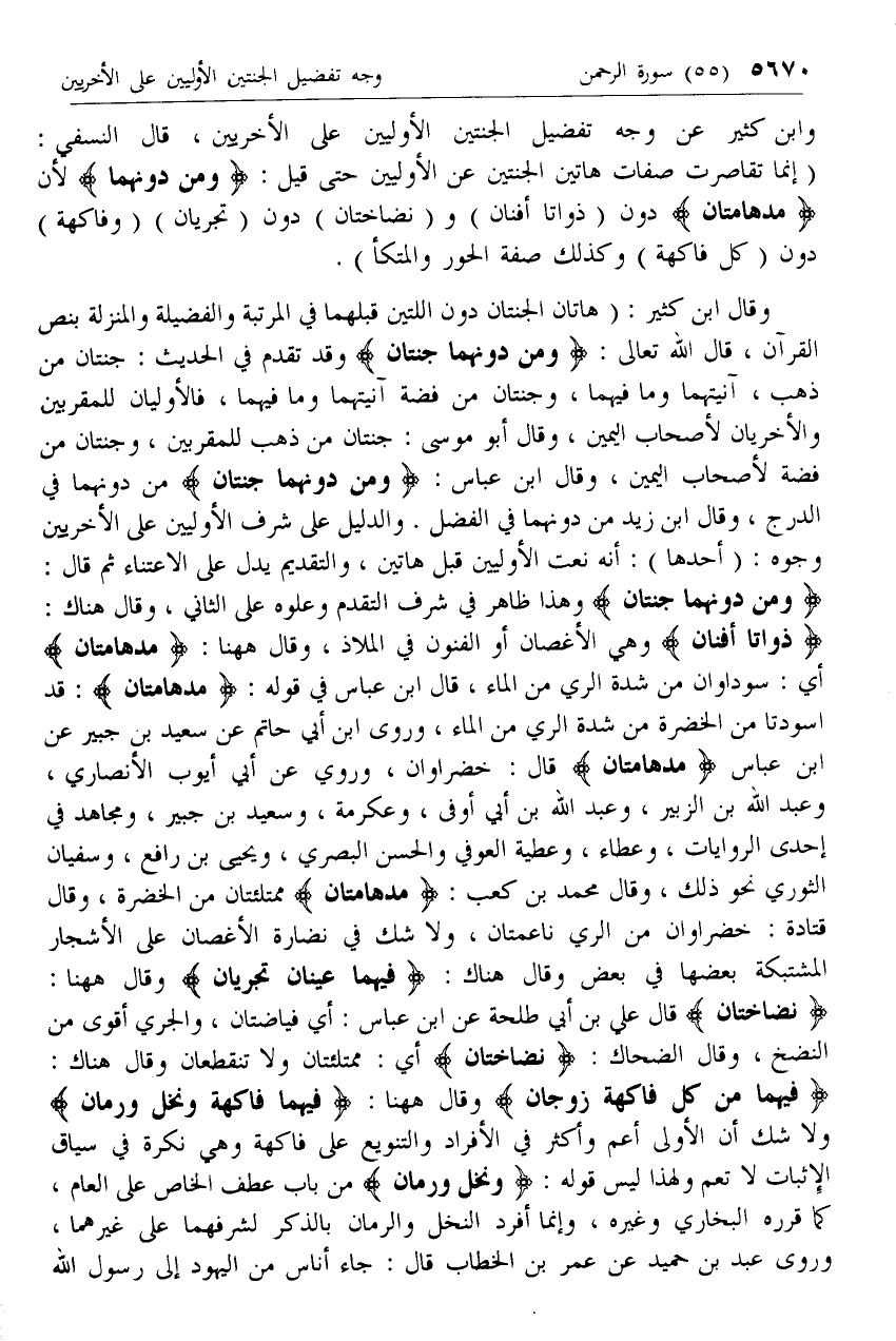 ذَواتا أَفْنانٍ وهي الأغصان أو الفنون في الملاذ، وقال هاهنا: مُدْهامَّتانِ أي: سوداوان من شدة الري من الماء، قال ابن عباس في قوله: مُدْهامَّتانِ: قد اسودتا من الخضرة من شدة الري من الماء، وروى ابن أبي حاتم عن سعيد بن جبير عن ابن عباس مُدْهامَّتانِ قال: خضراوان، وروي عن أبي أيوب الأنصاري، وعبد الله بن الزبير، وعبد الله بن أبي أوفى، وعكرمة، وسعيد بن جبير، ومجاهد في إحدى الروايات، وعطاء، وعطية العوفي والحسن البصري، ويحيى بن رافع، وسفيان الثوري نحو ذلك، وقال محمد بن كعب: مُدْهامَّتانِ ممتلئتان من الخضرة، وقال قتادة: خضراوان من الري ناعمتان، ولا شك في نضارة الأغصان على الأشجار المشتبكة بعضها في بعض وقال هناك: فِيهِما عَيْنانِ تَجْرِيانِ وقال هاهنا: