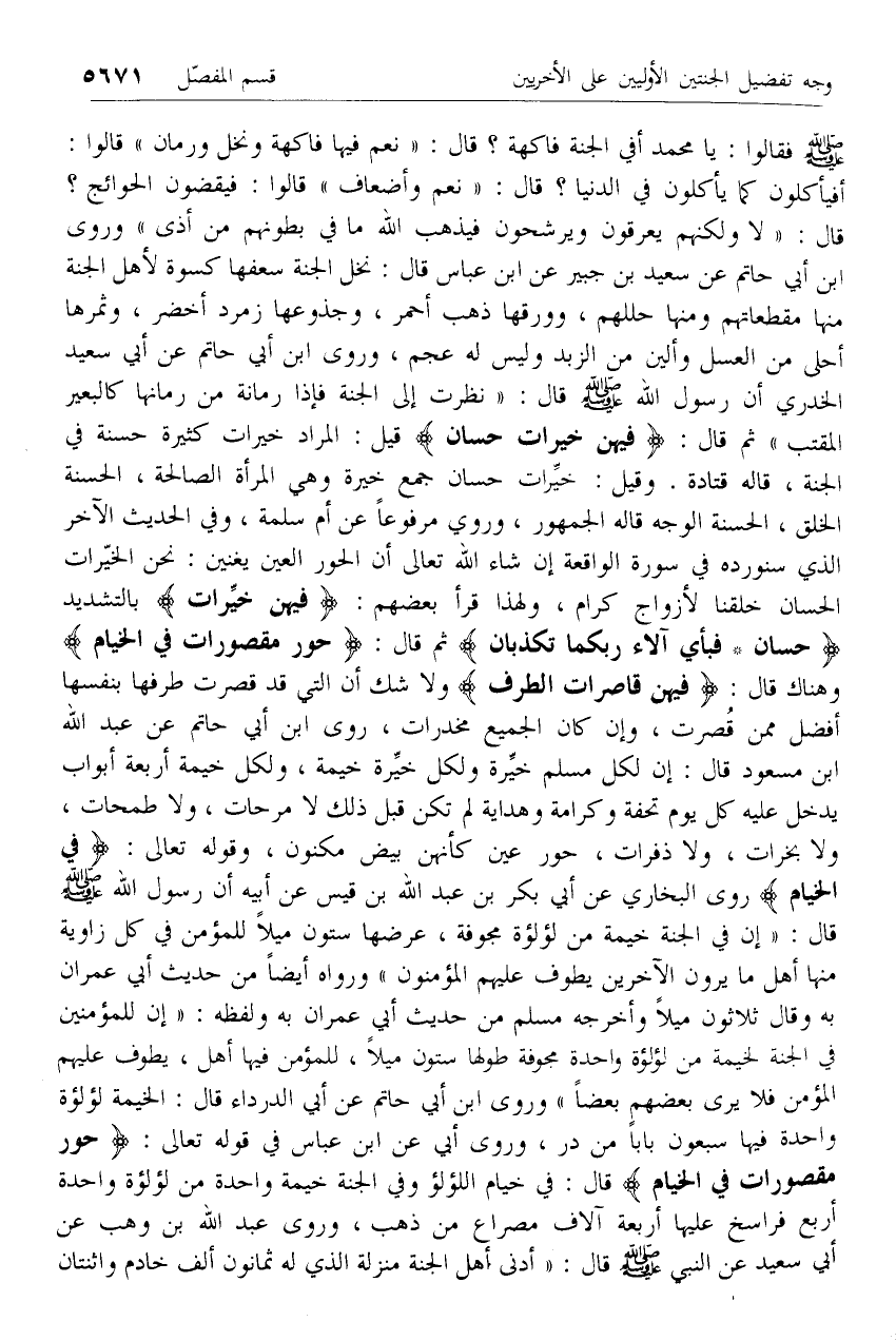قال: «لا ولكنهم يعرقون ويرشحون فيذهب الله ما في بطونهم من أذى» وروى ابن أبي حاتم عن سعيد بن جبير عن ابن عباس قال: نخل الجنة سعفها كسوة لأهل الجنة منها مقطعاتهم ومنها حللهم، وورقها ذهب أحمر، وجذوعها زمرد أخضر، وثمرها أحلى من العسل وألين من الزبد وليس له عجم، وروى ابن أبي حاتم عن أبي سعيد الخدري أن رسول الله صلى الله عليه وسلم قال: «نظرت إلى الجنة فإذا رمانة من رمانها كالبعير المقتب» ثم قال: فِيهِنَّ خَيْراتٌ حِسانٌ قيل: المراد خيرات كثيرة حسنة في الجنة، قاله قتادة. وقيل: خيرات حسان جمع خيرة وهي المرأة الصالحة، الحسنة الخلق، الحسنة الوجه قاله الجمهور، وروي مرفوعا عن أم سلمة، وفي الحديث الآخر الذي سنورده في سورة الواقعة إن شاء الله تعالى أن الحور العين يغنين: نحن الخيرات الحسان خلقنا لأزواج كرام، ولهذا قرأ بعضهم: فِيهِنَّ خَيْراتٌ بالتشديد حِسانٌ* فَبِأَيِّ آلاءِ رَبِّكُما تُكَذِّبانِ ثم قال: حُورٌ مَقْصُوراتٌ فِي الْخِيامِ وهناك قال: فِيهِنَّ قاصِراتُ الطَّرْفِ ولا شك أن التي قد قصرت طرفها بنفسها أفضل ممن قصرت، وإن كان الجميع مخدرات، روى ابن أبي حاتم عن عبد الله ابن مسعود قال: إن لكل مسلم خيرة ولكل خيرة خيمة، ولكل خيمة أربعة أبواب يدخل عليه كل يوم تحفة وكرامة وهداية لم تكن قبل ذلك لا مرحات، ولا طمحات، ولا بخرات، ولا ذفرات، حور عين كأنهن بيض مكنون، وقوله تعالى: فِي الْخِيامِ روى البخاري عن أبي بكر بن عبد الله بن قيس عن أبيه أن رسول الله صلى الله عليه وسلم قال: «إن في الجنة خيمة من لؤلؤة مجوفة، عرضها ستون ميلا للمؤمن في كل زاوية منها أهل ما يرون الآخرين يطوف عليهم المؤمنون» ورواه أيضا من حديث أبي عمران به وقال ثلاثون ميلا وأخرجه مسلم من حديث أبي عمران به ولفظه: «إن للمؤمنين في الجنة لخيمة من لؤلؤة واحدة مجوفة طولها ستون ميلا، للمؤمن فيها أهل، يطوف عليهم المؤمن فلا يرى بعضهم بعضا» وروى ابن أبي حاتم عن أبي الدرداء قال: الخيمة لؤلؤة واحدة فيها سبعون بابا من در، وروى أبي عن ابن عباس في قوله تعالى: حُورٌ مَقْصُوراتٌ فِي الْخِيامِ قال: في خيام اللؤلؤ وفي الجنة خيمة واحدة من لؤلؤة واحدة أربع فراسخ عليها أربعة آلاف مصراع من ذهب، وروى عبد الله بن وهب عن أبي سعيد عن النبي صلى الله عليه وسلم قال: «أدنى أهل الجنة منزلة الذي له ثمانون ألف خادم واثنتان