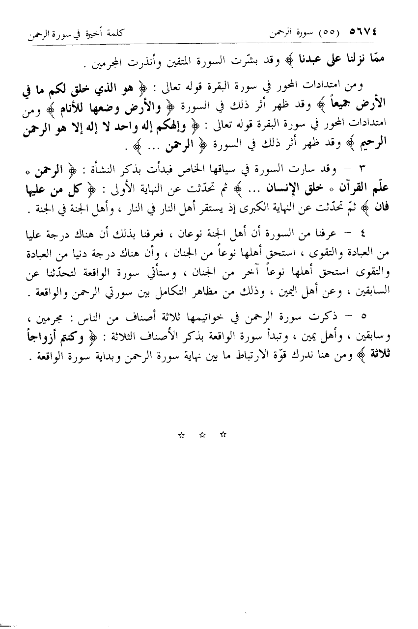 3 - وقد سارت السورة في سياقها الخاص فبدأت بذكر النشأة: الرَّحْمنُ* عَلَّمَ الْقُرْآنَ* خَلَقَ الْإِنْسانَ ... ثم تحدثت عن النهاية الأولى: كُلُّ مَنْ عَلَيْها فانٍ ثم تحدثت عن النهاية الكبرى إذ يستقر أهل النار في النار، وأهل الجنة في الجنة.