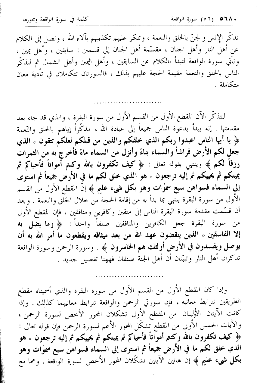 كَيْفَ تَكْفُرُونَ بِاللَّهِ وَكُنْتُمْ أَمْواتاً فَأَحْياكُمْ ثُمَّ يُمِيتُكُمْ ثُمَّ يُحْيِيكُمْ ثُمَّ إِلَيْهِ تُرْجَعُونَ* هُوَ الَّذِي خَلَقَ لَكُمْ ما فِي الْأَرْضِ جَمِيعاً ثُمَّ اسْتَوى إِلَى السَّماءِ فَسَوَّاهُنَّ سَبْعَ سَماواتٍ وَهُوَ بِكُلِّ شَيْءٍ عَلِيمٌ إن هاتين الآيتين تشكلان المحور الأخص لسورة الواقعة، وهما مع