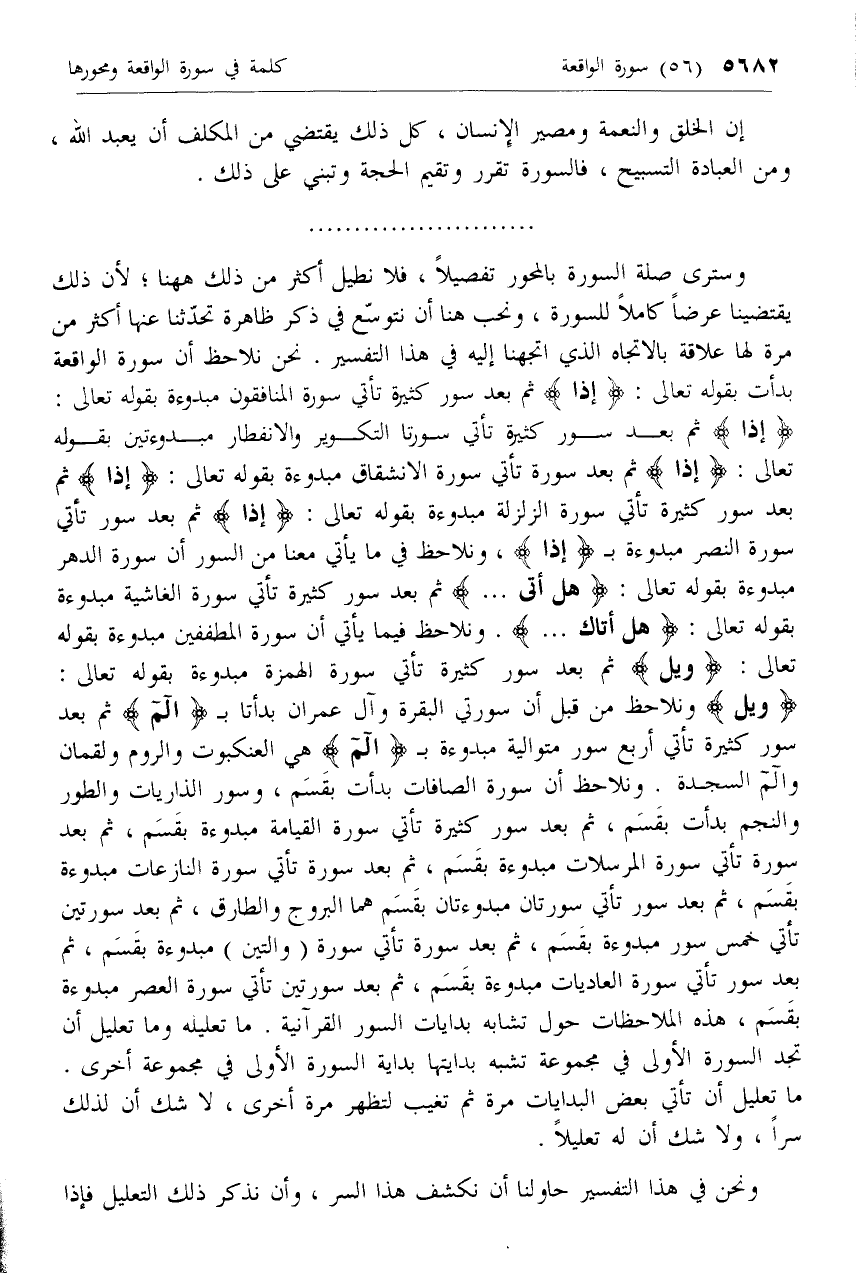 وسترى صلة السورة بالمحور تفصيلا، فلا نطيل أكثر من ذلك هاهنا؛ لأن ذلك يقتضينا عرضا كاملا للسورة، ونحب هنا أن نتوسع في ذكر ظاهرة تحدثنا عنها أكثر من مرة لها علاقة بالاتجاه الذي اتجهنا إليه في هذا التفسير. نحن نلاحظ أن سورة الواقعة بدأت بقوله تعالى: إِذا ثم بعد سور كثيرة تأتي سورة المنافقون مبدوءة بقوله تعالى: