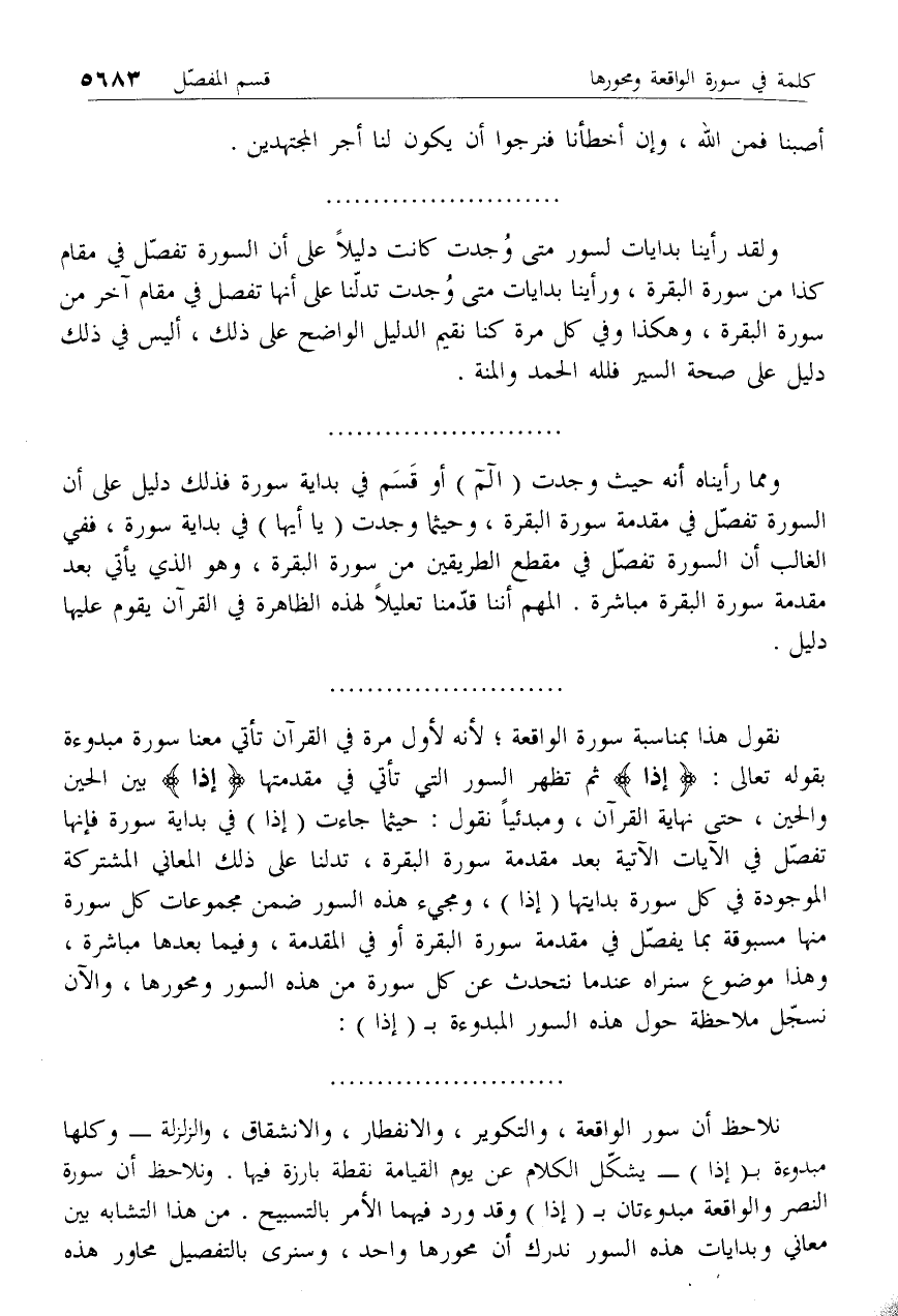 نقول هذا بمناسبة سورة الواقعة؛ لأنه لأول مرة في القرآن تأتي معنا سورة مبدوءة بقوله تعالى: إِذا ثم تظهر السور التي تأتي في مقدمتها إِذا* بين الحين والحين، حتى نهاية القرآن، ومبدئيا نقول: حيثما جاءت (إذا) في بداية سورة فإنها تفصل في الآيات الآتية بعد مقدمة سورة البقرة، تدلنا على ذلك المعاني المشتركة الموجودة في كل سورة بدايتها (إذا)، ومجيء هذه السور ضمن مجموعات كل سورة منها مسبوقة بما يفصل في مقدمة سورة البقرة أو في المقدمة، وفيما بعدها مباشرة، وهذا موضوع سنراه عند ما نتحدث عن كل سورة من هذه السور ومحورها، والآن نسجل ملاحظة حول هذه السور المبدوءة ب (إذا):