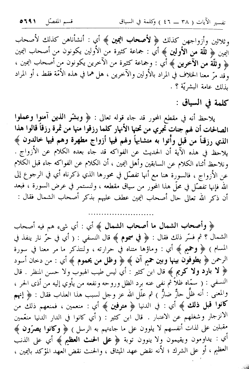ونلاحظ أثناء الكلام عن السابقين وأهل اليمين، أن الكلام عن الفواكه جاء قبل الكلام عن الأزواج، فالسورة هنا مع أنها تفصل في محورها الذي ذكرناه أي في الرجوع إلى الله فإنها تفصل في محل هذا المحور من سياق مقطعه، ولنستمر في عرض السورة، فبعد أن ذكر الله تعالى حال أصحاب اليمين عطف عليهم بذكر أصحاب الشمال فقال: