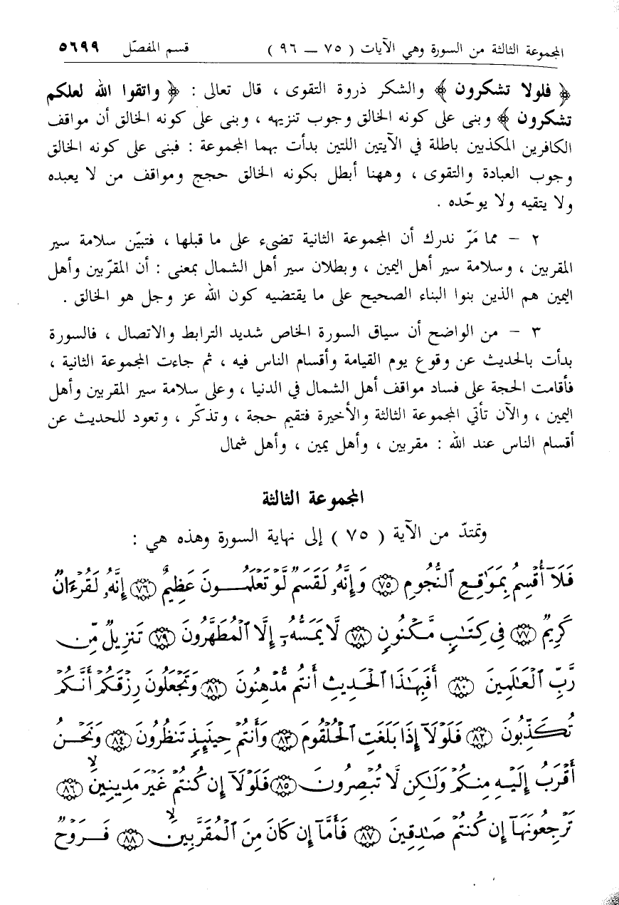 2 - مما مر ندرك أن المجموعة الثانية تضئ على ما قبلها، فتبين سلامة سير المقربين، وسلامة سير أهل اليمين، وبطلان سير أهل الشمال بمعنى: أن المقربين وأهل اليمين هم الذين بنوا البناء الصحيح على ما يقتضيه كون الله عزّ وجل هو الخالق.