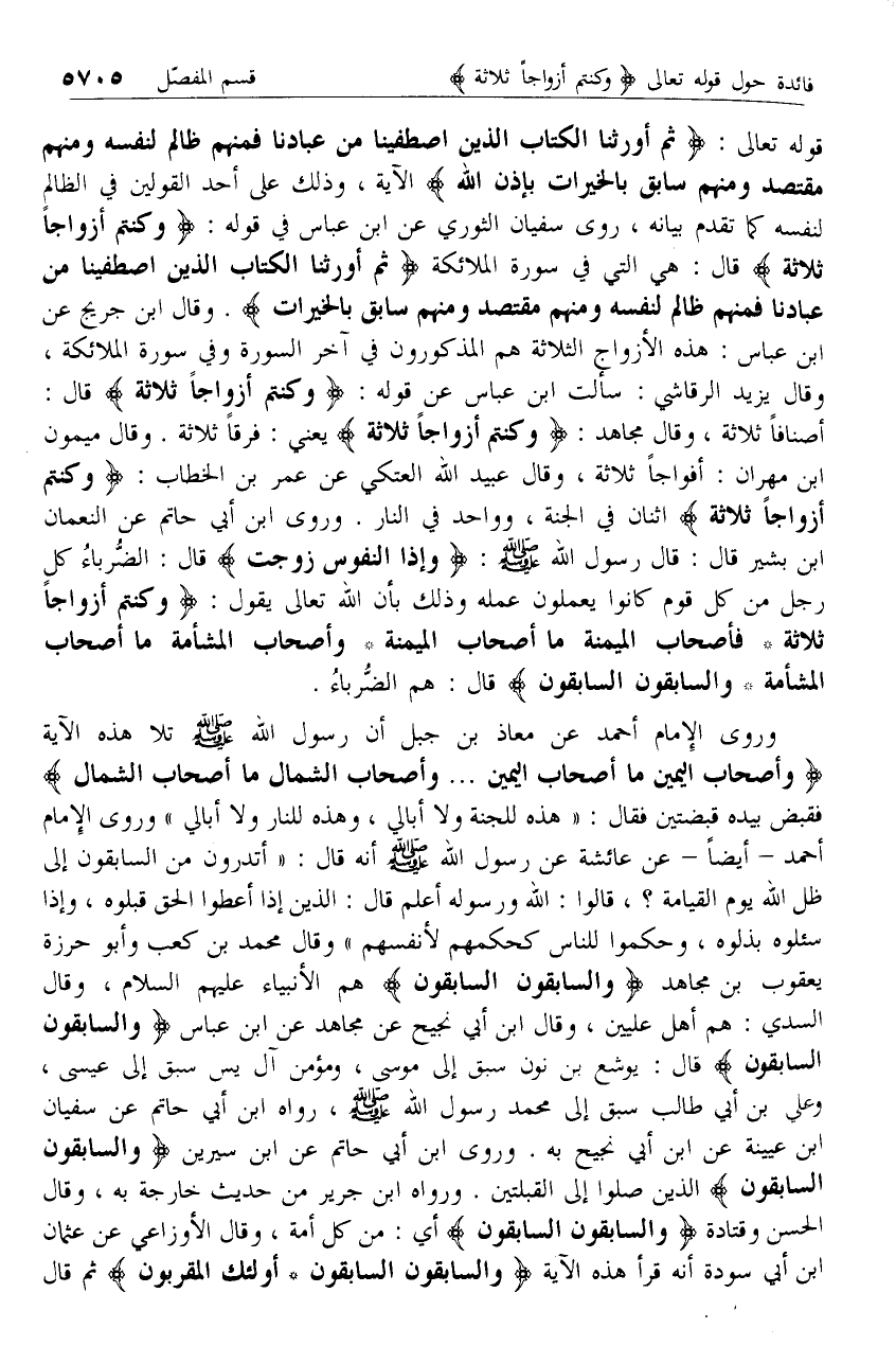قوله تعالى: ثُمَّ أَوْرَثْنَا الْكِتابَ الَّذِينَ اصْطَفَيْنا مِنْ عِبادِنا فَمِنْهُمْ ظالِمٌ لِنَفْسِهِ وَمِنْهُمْ مُقْتَصِدٌ وَمِنْهُمْ سابِقٌ بِالْخَيْراتِ بِإِذْنِ اللَّهِ الآية، وذلك على أحد القولين في الظالم لنفسه كما تقدم بيانه، روى سفيان الثوري عن ابن عباس في قوله: وَكُنْتُمْ أَزْواجاً ثَلاثَةً قال: هي التي في سورة الملائكة ثُمَّ أَوْرَثْنَا الْكِتابَ الَّذِينَ اصْطَفَيْنا مِنْ عِبادِنا فَمِنْهُمْ ظالِمٌ لِنَفْسِهِ وَمِنْهُمْ مُقْتَصِدٌ وَمِنْهُمْ سابِقٌ بِالْخَيْراتِ. وقال ابن جريج عن ابن عباس: هذه الأزواج الثلاثة هم المذكورون في آخر السورة وفي سورة الملائكة، وقال يزيد الرقاشي: سألت ابن عباس عن قوله: وَكُنْتُمْ أَزْواجاً ثَلاثَةً قال: