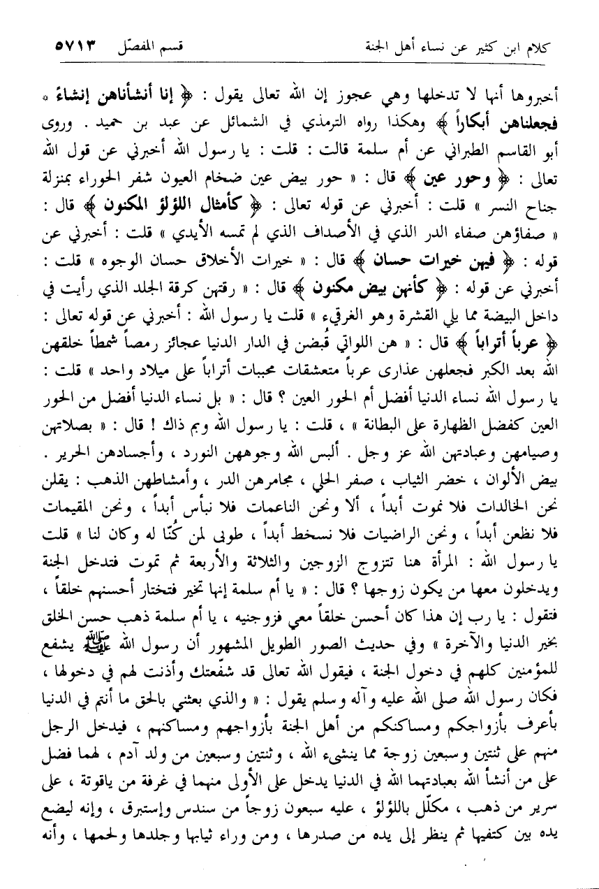 أخبروها أنها لا تدخلها وهي عجوز إن الله تعالى يقول: إِنَّا أَنْشَأْناهُنَّ إِنْشاءً* فَجَعَلْناهُنَّ أَبْكاراً وهكذا رواه الترمذي في الشمائل عن عبد بن حميد. وروى أبو القاسم الطبراني عن أم سلمة قالت: قلت: يا رسول الله أخبرني عن قول الله تعالى: وَحُورٌ عِينٌ قال: «حور بيض عين ضخام العيون شفر الحوراء بمنزلة جناح النسر» قلت: أخبرني عن قوله تعالى: كَأَمْثالِ اللُّؤْلُؤِ الْمَكْنُونِ قال: