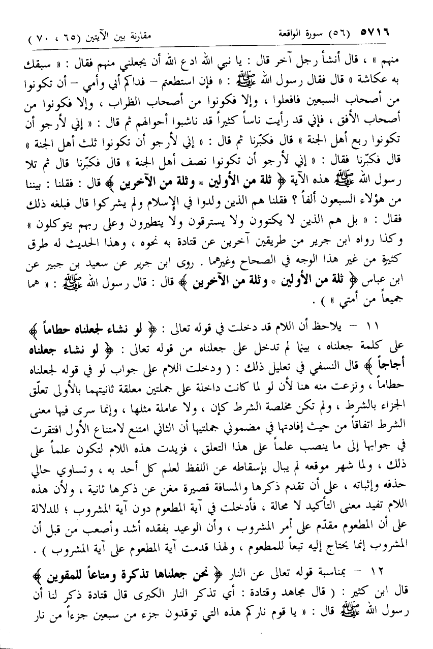 12 - بمناسبة قوله تعالى عن النار نَحْنُ جَعَلْناها تَذْكِرَةً وَمَتاعاً لِلْمُقْوِينَ قال ابن كثير: (قال مجاهد وقتادة: أي تذكر النار الكبرى قال قتادة ذكر لنا أن رسول الله صلى الله عليه وسلم قال: «يا قوم ناركم هذه التي توقدون جزء من سبعين جزءا من نار