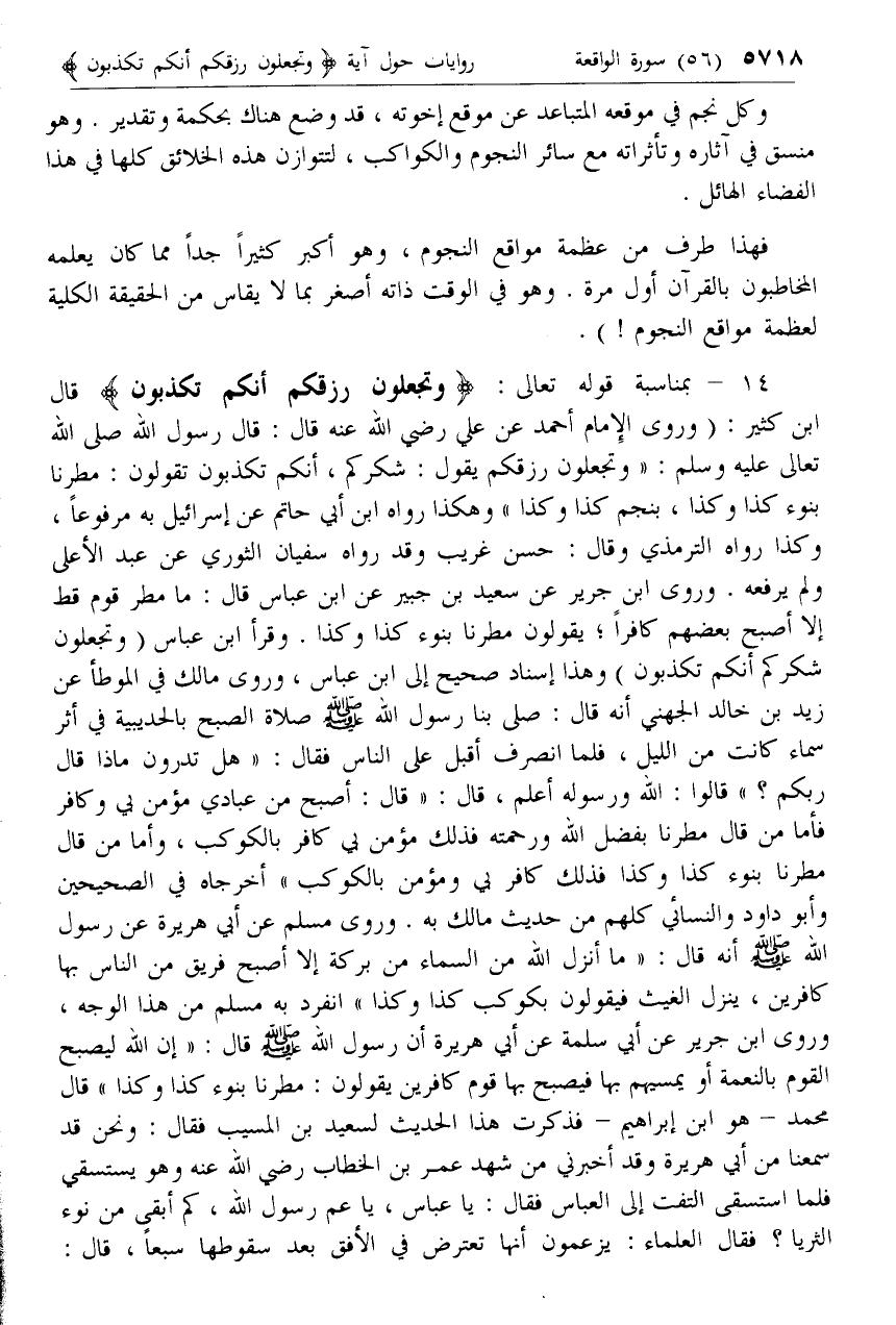 14 - بمناسبة قوله تعالى: وَتَجْعَلُونَ رِزْقَكُمْ أَنَّكُمْ تُكَذِّبُونَ قال ابن كثير: (وروى الإمام أحمد عن علي رضي الله عنه قال: قال رسول الله صلى الله تعالى عليه وسلم: «وتجعلون رزقكم يقول: شكركم، أنكم تكذبون تقولون: مطرنا بنوء كذا وكذا، بنجم كذا وكذا» وهكذا رواه ابن أبي حاتم عن إسرائيل به مرفوعا، وكذا رواه الترمذي وقال: حسن غريب وقد رواه سفيان الثوري عن عبد الأعلى ولم يرفعه. وروى ابن جرير عن سعيد بن جبير عن ابن عباس قال: ما مطر قوم قط إلا أصبح بعضهم كافرا؛ يقولون مطرنا بنوء كذا وكذا. وقرأ ابن عباس (وتجعلون شكركم أنكم تكذبون) وهذا إسناد صحيح إلى ابن عباس، وروى مالك في الموطأ عن زيد بن خالد الجهني أنه قال: صلى بنا رسول الله صلى الله عليه وسلم صلاة الصبح بالحديبية في أثر سماء كانت من الليل، فلما انصرف أقبل على الناس فقال: «هل تدرون ماذا قال ربكم؟» قالوا: الله ورسوله أعلم، قال: «قال: أصبح من عبادي مؤمن بي وكافر فأما من قال مطرنا بفضل الله ورحمته فذلك مؤمن بي كافر بالكوكب، وأما من قال مطرنا بنوء كذا وكذا فذلك كافر بي ومؤمن بالكوكب» أخرجاه في الصحيحين وأبو داود والنسائي كلهم من حديث مالك به. وروى مسلم عن أبي هريرة عن رسول الله صلى الله عليه وسلم أنه قال: «ما أنزل الله من السماء من بركة إلا أصبح فريق من الناس بها كافرين، ينزل الغيث فيقولون بكوكب كذا وكذا» انفرد به مسلم من هذا الوجه، وروى ابن جرير عن أبي سلمة عن أبي هريرة أن رسول الله صلى الله عليه وسلم قال: «إن الله ليصبح القوم بالنعمة أو يمسيهم بها فيصبح بها قوم كافرين يقولون: مطرنا بنوء كذا وكذا» قال محمد- هو ابن إبراهيم- فذكرت هذا الحديث لسعيد بن المسيب فقال: ونحن قد سمعنا من أبي هريرة وقد أخبرني من شهد عمر بن الخطاب رضي الله عنه وهو يستسقي فلما استسقى التفت إلى العباس فقال: يا عباس، يا عم رسول الله، كم أبقى من نوء الثريا؟ فقال العلماء: يزعمون أنها تعترض في الأفق بعد سقوطها سبعا، قال: