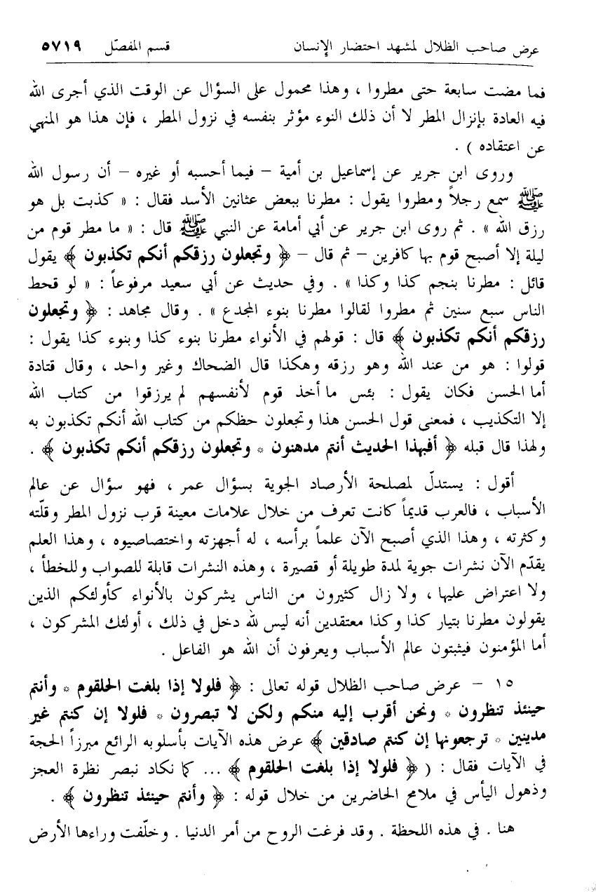 15 - عرض صاحب الظلال قوله تعالى: فَلَوْلا إِذا بَلَغَتِ الْحُلْقُومَ* وَأَنْتُمْ حِينَئِذٍ تَنْظُرُونَ* وَنَحْنُ أَقْرَبُ إِلَيْهِ مِنْكُمْ وَلكِنْ لا تُبْصِرُونَ* فَلَوْلا إِنْ كُنْتُمْ غَيْرَ مَدِينِينَ* تَرْجِعُونَها إِنْ كُنْتُمْ صادِقِينَ عرض هذه الآيات بأسلوبه الرائع مبرزا الحجة في الآيات فقال: (فَلَوْلا إِذا بَلَغَتِ الْحُلْقُومَ ... كما نكاد نبصر نظرة العجز وذهول اليأس في ملامح الحاضرين من خلال قوله: وَأَنْتُمْ حِينَئِذٍ تَنْظُرُونَ.