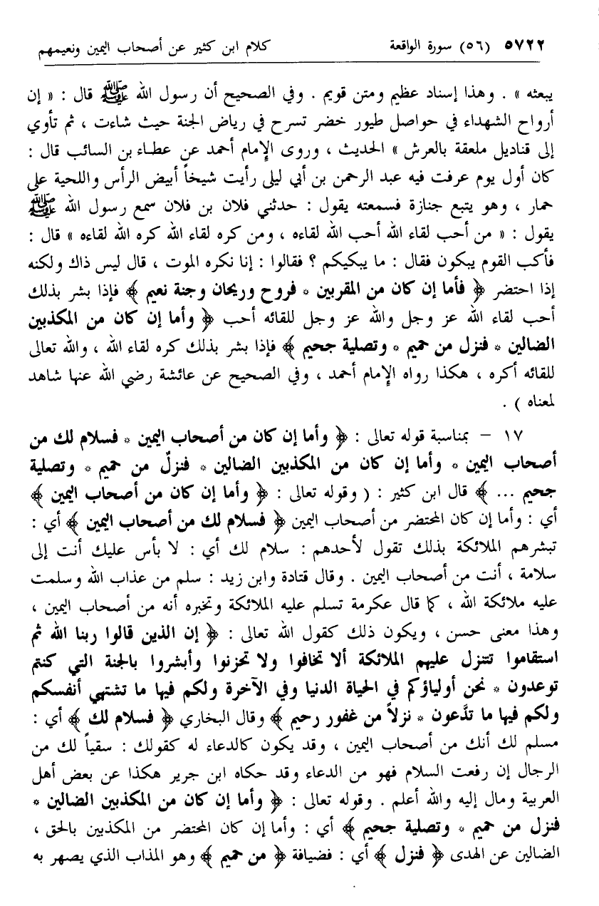 17 - بمناسبة قوله تعالى: وَأَمَّا إِنْ كانَ مِنْ أَصْحابِ الْيَمِينِ* فَسَلامٌ لَكَ مِنْ أَصْحابِ الْيَمِينِ* وَأَمَّا إِنْ كانَ مِنَ الْمُكَذِّبِينَ الضَّالِّينَ* فَنُزُلٌ مِنْ حَمِيمٍ* وَتَصْلِيَةُ جَحِيمٍ ... قال ابن كثير: (وقوله تعالى: وَأَمَّا إِنْ كانَ مِنْ أَصْحابِ الْيَمِينِ أي: وأما إن كان المحتضر من أصحاب اليمين فَسَلامٌ لَكَ مِنْ أَصْحابِ الْيَمِينِ أي: