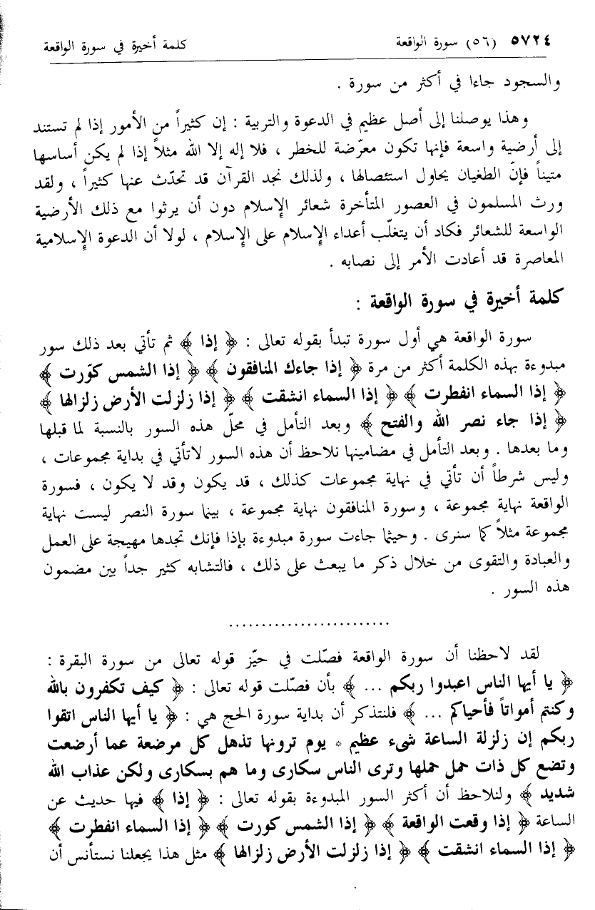 سورة الواقعة هي أول سورة تبدأ بقوله تعالى: إِذا ثم تأتي بعد ذلك سور مبدوءة بهذه الكلمة أكثر من مرة إِذا جاءَكَ الْمُنافِقُونَ إِذَا الشَّمْسُ كُوِّرَتْ إِذَا السَّماءُ انْفَطَرَتْ إِذَا السَّماءُ انْشَقَّتْ إِذا زُلْزِلَتِ الْأَرْضُ زِلْزالَها إِذا جاءَ نَصْرُ اللَّهِ وَالْفَتْحُ وبعد التأمل في محل هذه السور بالنسبة لما قبلها وما بعدها. وبعد التأمل في مضامينها نلاحظ أن هذه السور لا تأتي في بداية مجموعات، وليس شرطا أن تأتي في نهاية مجموعات كذلك، قد يكون وقد لا يكون، فسورة الواقعة نهاية مجموعة، وسورة المنافقون نهاية مجموعة، بينما سورة النصر ليست نهاية مجموعة مثلا كما سنرى. وحيثما جاءت سورة مبدوءة بإذا فإنك تجدها مهيجة على العمل والعبادة والتقوى من خلال ذكر ما يبعث على ذلك، فالتشابه كثير جدا بين مضمون هذه السور.
