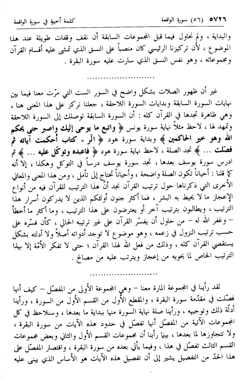 غير أن ظهور الصلات بشكل واضح في السور الست التي مرت معنا فيما بين نهايات السورة السابقة وبدايات السورة اللاحقة، جعلنا نركز على هذا المعنى هنا، وهي ظاهرة تجدها في القرآن كله: أن السورة السابقة توصلك إلى السورة اللاحقة وتمهد لها، لاحظ مثلا نهاية سورة يونس وَاتَّبِعْ ما يُوحى إِلَيْكَ وَاصْبِرْ حَتَّى يَحْكُمَ اللَّهُ وَهُوَ خَيْرُ الْحاكِمِينَ وبداية سورة هود الر* كِتابٌ أُحْكِمَتْ آياتُهُ ثُمَّ فُصِّلَتْ ... تجد الصلة، لاحظ نهاية سورة هود فَاعْبُدْهُ وَتَوَكَّلْ عَلَيْهِ ... ثم ادرس سورة يوسف بعدها، تجد سورة يوسف درسا في التوكل وهكذا، إلا أنه كما قلنا: أحيانا تكون الصلة واضحة، وأحيانا تحتاج إلى تأمل، ومن هذا المعنى والمعاني الأخرى التي ذكرناها حول ترتيب القرآن نجد أن هذا الترتيب للقرآن فيه من أنواع الإعجاز ما لا يحيط به البشر، فما أكثر جنون أولئكم الذين لا يدركون أسرار هذا الترتيب، ويطالبون بترتيب آخر أو يعترضون على هذا الترتيب، وما أكثر ما أخطأ- وغفر الله له- من حاول أن يفسر القرآن على غير ترتيبه الحالي، كأن فسره على حسب ترتيب النزول في زعمه، وهو موضوع لا توجد أدواته أصلا ولا أدلته بشكل يستقصي القرآن كله، وذلك من فعل الله لهذا القرآن؛ حتى لا تفكر الأمة إلا بهذا الترتيب الخاص لما يحويه من إعجاز ويترتب عليه من مصالح.