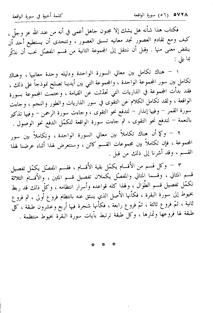 1 - هناك تكامل بين معاني السورة الواحدة ودليله وحدة معانيها، وهناك تكامل بين سور المجموعة الواحدة، والمجموعة التي بين أيدينا تصلح نموذجا على ذلك، فقد بدأت المجموعة في الذاريات التي تحدثت عن القيامة، وختمت المجموعة بسورة الواقعة، ولقد تكامل الكلام عن التقوى في سور الذاريات والطور والنجم، وجاءت سورة القمر- وفيها إنذار- لتدفع نحو التقوى، وجاءت سورة الرحمن- وفيها تذكير بالنعمة- لتدفع نحو التقوى، ثم جاءت سورة الواقعة لتكمل الدفع نحو الوصول.