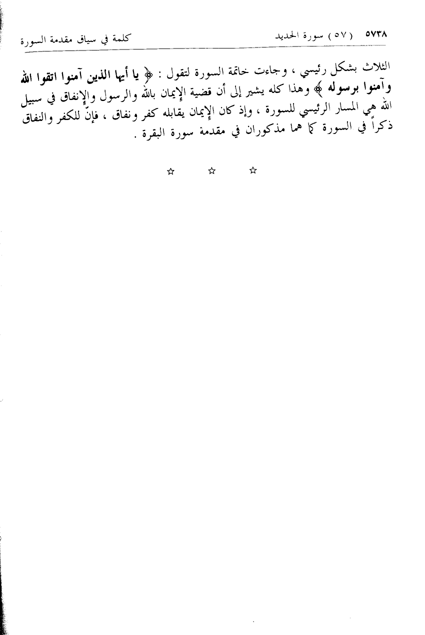 الثلاث بشكل رئيسي، وجاءت خاتمة السورة لتقول: يا أَيُّهَا الَّذِينَ آمَنُوا اتَّقُوا اللَّهَ وَآمِنُوا بِرَسُولِهِ وهذا كله يشير إلى أن قضية الإيمان بالله والرسول والإنفاق في سبيل الله هي المسار الرئيسي للسورة، وإذ كان الإيمان يقابله كفر ونفاق، فإن للكفر والنفاق ذكرا في السورة كما هما مذكوران في مقدمة سورة البقرة.