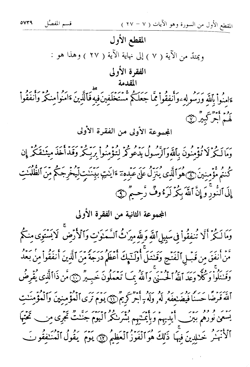 وَما لَكُمْ أَلاَّ تُنْفِقُوا فِي سَبِيلِ اللَّهِ وَلِلَّهِ مِيراثُ السَّماواتِ وَالْأَرْضِ لا يَسْتَوِي مِنْكُمْ مَنْ أَنْفَقَ مِنْ قَبْلِ الْفَتْحِ وَقاتَلَ أُولئِكَ أَعْظَمُ دَرَجَةً مِنَ الَّذِينَ أَنْفَقُوا مِنْ بَعْدُ وَقاتَلُوا وَكُلاًّ وَعَدَ اللَّهُ الْحُسْنى وَاللَّهُ بِما تَعْمَلُونَ خَبِيرٌ (10) مَنْ ذَا الَّذِي يُقْرِضُ اللَّهَ قَرْضاً حَسَناً فَيُضاعِفَهُ لَهُ وَلَهُ أَجْرٌ كَرِيمٌ (11) يَوْمَ تَرَى الْمُؤْمِنِينَ وَالْمُؤْمِناتِ يَسْعى نُورُهُمْ بَيْنَ أَيْدِيهِمْ وَبِأَيْمانِهِمْ بُشْراكُمُ الْيَوْمَ جَنَّاتٌ تَجْرِي مِنْ تَحْتِهَا الْأَنْهارُ خالِدِينَ فِيها ذلِكَ هُوَ الْفَوْزُ الْعَظِيمُ (12) يَوْمَ يَقُولُ الْمُنافِقُونَ وَالْمُنافِقاتُ لِلَّذِينَ آمَنُوا انْظُرُونا نَقْتَبِسْ مِنْ نُورِكُمْ قِيلَ ارْجِعُوا وَراءَكُمْ فَالْتَمِسُوا نُوراً فَضُرِبَ بَيْنَهُمْ بِسُورٍ لَهُ بابٌ باطِنُهُ فِيهِ الرَّحْمَةُ وَظاهِرُهُ مِنْ قِبَلِهِ الْعَذابُ (13) يُنادُونَهُمْ أَلَمْ نَكُنْ مَعَكُمْ قالُوا بَلى وَلكِنَّكُمْ فَتَنْتُمْ أَنْفُسَكُمْ وَتَرَبَّصْتُمْ وَارْتَبْتُمْ وَغَرَّتْكُمُ الْأَمانِيُّ حَتَّى جاءَ أَمْرُ اللَّهِ وَغَرَّكُمْ بِاللَّهِ الْغَرُورُ (14)