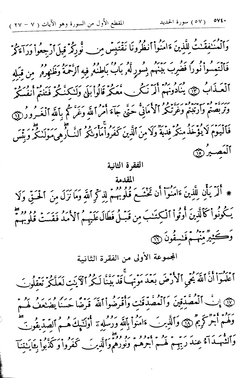 أَلَمْ يَأْنِ لِلَّذِينَ آمَنُوا أَنْ تَخْشَعَ قُلُوبُهُمْ لِذِكْرِ اللَّهِ وَما نَزَلَ مِنَ الْحَقِّ وَلا يَكُونُوا كَالَّذِينَ أُوتُوا الْكِتابَ مِنْ قَبْلُ فَطالَ عَلَيْهِمُ الْأَمَدُ فَقَسَتْ قُلُوبُهُمْ وَكَثِيرٌ مِنْهُمْ فاسِقُونَ (16)