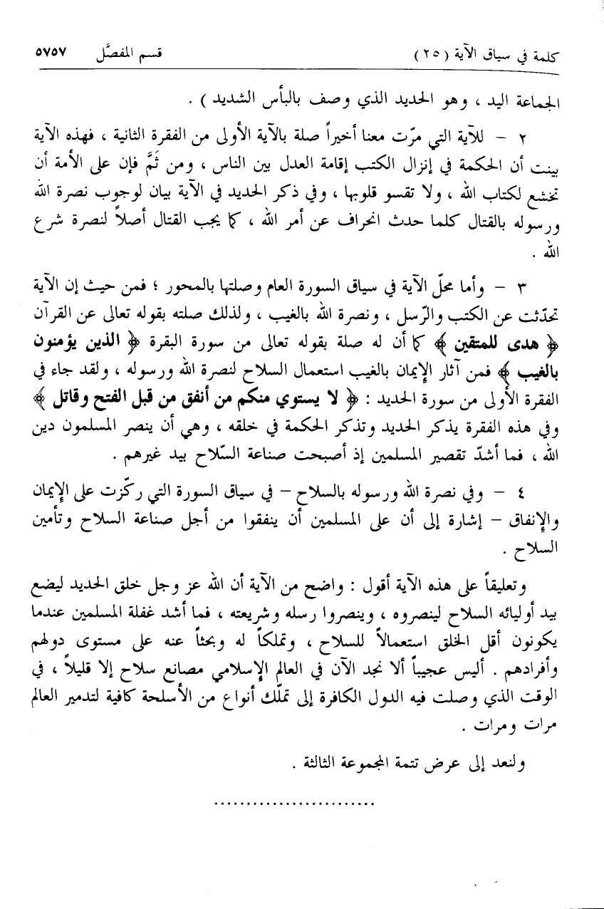 3 - وأما محل الآية في سياق السورة العام وصلتها بالمحور؛ فمن حيث إن الآية تحدثت عن الكتب والرسل، ونصرة الله بالغيب، ولذلك صلته بقوله تعالى عن القرآن هُدىً لِلْمُتَّقِينَ كما أن له صلة بقوله تعالى من سورة البقرة الَّذِينَ يُؤْمِنُونَ بِالْغَيْبِ فمن آثار الإيمان بالغيب استعمال السلاح لنصرة الله ورسوله، ولقد جاء في الفقرة الأولى من سورة الحديد: لا يَسْتَوِي مِنْكُمْ مَنْ أَنْفَقَ مِنْ قَبْلِ الْفَتْحِ وَقاتَلَ وفي هذه الفقرة يذكر الحديد وتذكر الحكمة في خلقه، وهي أن ينصر المسلمون دين الله، فما أشد تقصير المسلمين إذ أصبحت صناعة السلاح بيد غيرهم.