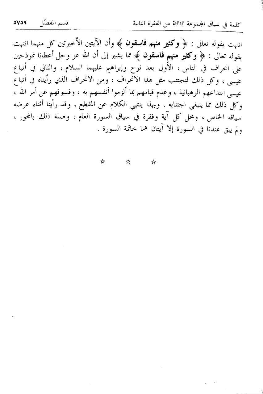 انتهت بقوله تعالى: وَكَثِيرٌ مِنْهُمْ فاسِقُونَ وأن الآيتين الأخيرتين كل منهما انتهت بقوله تعالى: وَكَثِيرٌ مِنْهُمْ فاسِقُونَ مما يشير إلى أن الله عزّ وجل أعطانا نموذجين على انحراف في الناس، الأول بعد نوح وإبراهيم عليهما السلام، والثاني في أتباع عيسى، وكل ذلك لنجتنب مثل هذا الانحراف، ومن الانحراف الذي رأيناه في أتباع عيسى ابتداعهم الرهبانية، وعدم قيامهم بما ألزموا أنفسهم به، وفسوقهم عن أمر الله، وكل ذلك مما ينبغي اجتنابه. وبهذا ينتهي الكلام عن المقطع، وقد رأينا أثناء عرضه سياقه الخاص، ومحل كل آية وفقرة في سياق السورة العام، وصلة ذلك بالمحور، ولم يبق عندنا في السورة إلا آيتان هما خاتمة السورة.