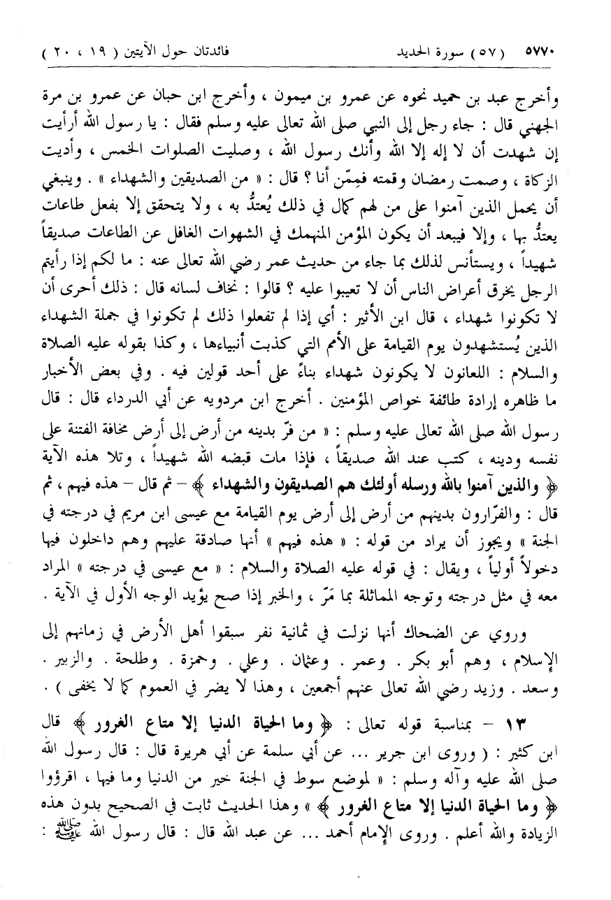13 - بمناسبة قوله تعالى: وَمَا الْحَياةُ الدُّنْيا إِلَّا مَتاعُ الْغُرُورِ قال ابن كثير: (وروى ابن جرير ... عن أبي سلمة عن أبي هريرة قال: قال رسول الله صلى الله عليه وآله وسلم: «لموضع سوط في الجنة خير من الدنيا وما فيها، اقرءوا وَمَا الْحَياةُ الدُّنْيا إِلَّا مَتاعُ الْغُرُورِ» وهذا الحديث ثابت في الصحيح بدون هذه الزيادة والله أعلم. وروى الإمام أحمد ... عن عبد الله قال: قال رسول الله صلى الله عليه وسلم:
