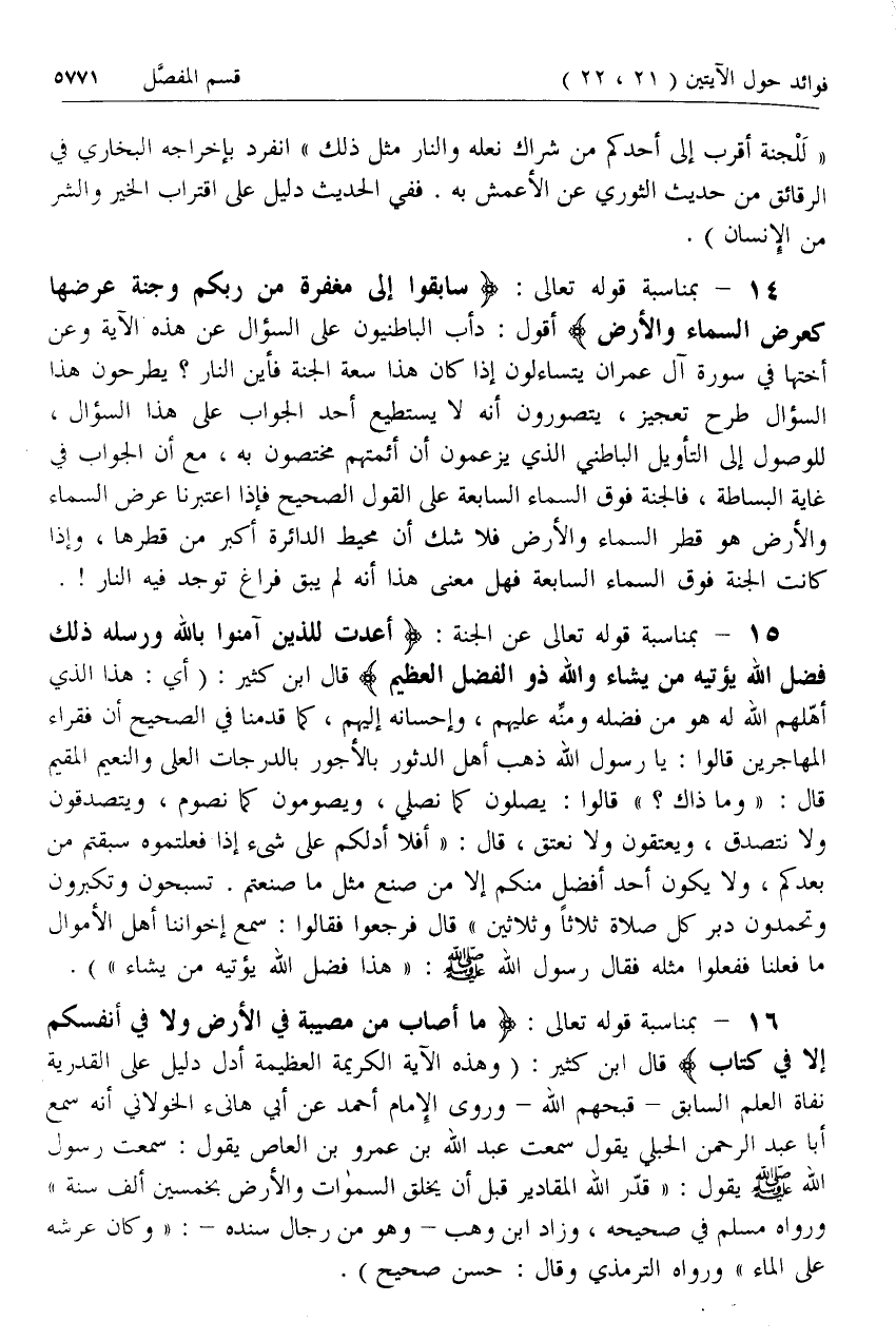 16 - بمناسبة قوله تعالى: ما أَصابَ مِنْ مُصِيبَةٍ فِي الْأَرْضِ وَلا فِي أَنْفُسِكُمْ إِلَّا فِي كِتابٍ قال ابن كثير: (وهذه الآية الكريمة العظيمة أدل دليل على القدرية نفاة العلم السابق- قبحهم الله- وروى الإمام أحمد عن أبي هانئ الخولاني أنه سمع أبا عبد الرحمن الحبلي يقول سمعت عبد الله بن عمرو بن العاص يقول: سمعت رسول الله صلى الله عليه وسلم يقول: «قدر الله المقادير قبل أن يخلق السموات والأرض بخمسين ألف سنة» ورواه مسلم في صحيحه، وزاد ابن وهب- وهو من رجال سنده-: «وكان عرشه على الماء» ورواه الترمذي وقال: حسن صحيح).