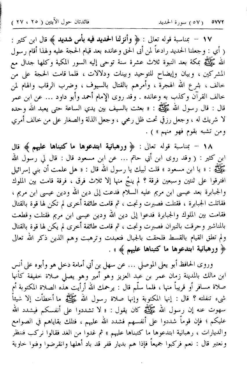 18 - بمناسبة قوله تعالى: وَرَهْبانِيَّةً ابْتَدَعُوها ما كَتَبْناها عَلَيْهِمْ قال ابن كثير: (وقد روى ابن أبي حاتم ... عن ابن مسعود قال: قال لي رسول الله صلى الله عليه وسلم: «يا ابن مسعود» قلت لبيك يا رسول الله قال: «هل علمت أن بني إسرائيل افترقوا على ثنتين وسبعين فرقة؟ لم ينج منها إلا ثلاث فرق، فرقة قامت بين الملوك والجبابرة بعد عيسى ابن مريم عليه السلام فدعت إلى دين الله ودين عيسى ابن مريم، فقاتلت الجبابرة، فقتلت فصبرت ونجت، ثم قامت طائفة أخرى لم تكن لها قوة بالقتال فقامت بين الملوك والجبابرة فدعوا إلى دين الله ودين عيسى ابن مريم فقتلت وقطعت بالمناشير وحرقت بالنيران فصبرت ونجت، ثم قامت طائفة أخرى لم يكن لها قوة بالقتال ولم تطق القيام بالقسط فلحقت بالجبال فتعبدت وترهبت وهم الذين ذكر الله تعالى وَرَهْبانِيَّةً ابْتَدَعُوها ما كَتَبْناها عَلَيْهِمْ».