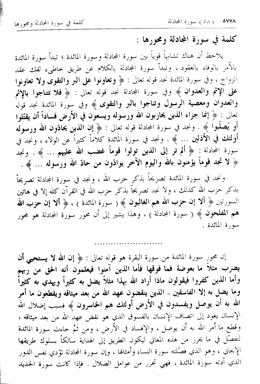هاتين السورتين أَلا إِنَّ حِزْبَ اللَّهِ هُمُ الْمُفْلِحُونَ (سورة المائدة)، أَلا إِنَّ حِزْبَ اللَّهِ هُمُ الْمُفْلِحُونَ (سورة المجادلة)، وهذا يشير إلى أن محور سورة المجادلة هو محور سورة المائدة.