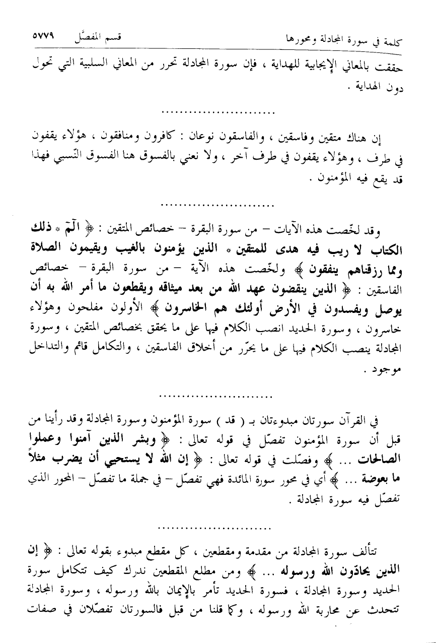 وقد لخصت هذه الآيات- من سورة البقرة- خصائص المتقين: الم* ذلِكَ الْكِتابُ لا رَيْبَ فِيهِ هُدىً لِلْمُتَّقِينَ* الَّذِينَ يُؤْمِنُونَ بِالْغَيْبِ وَيُقِيمُونَ الصَّلاةَ وَمِمَّا رَزَقْناهُمْ يُنْفِقُونَ ولخصت هذه الآية- من سورة البقرة- خصائص الفاسقين: الَّذِينَ يَنْقُضُونَ عَهْدَ اللَّهِ مِنْ بَعْدِ مِيثاقِهِ وَيَقْطَعُونَ ما أَمَرَ اللَّهُ بِهِ أَنْ يُوصَلَ وَيُفْسِدُونَ فِي الْأَرْضِ أُولئِكَ هُمُ الْخاسِرُونَ الأولون مفلحون وهؤلاء خاسرون، وسورة الحديد انصب الكلام فيها على ما يحقق بخصائص المتقين، وسورة المجادلة ينصب الكلام فيها على ما يحرر من أخلاق الفاسقين، والتكامل قائم والتداخل موجود.