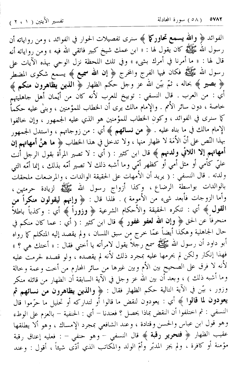 ثم بين الله عزّ وجل حكم الظهار الَّذِينَ يُظاهِرُونَ مِنْكُمْ أي: من العرب. قال النسفي: توبيخ للعرب لأنه كان من أيمان أهل جاهليتهم خاصة، دون سائر الأمم. والإمام مالك يرى أن الخطاب للمؤمنين، وبنى عليه حكما كما سنرى في الفوائد، وكون الخطاب للمؤمنين هو الذي عليه الجمهور، وإن خالفوا الإمام مالك في ما بناه عليه. مِنْ نِسائِهِمْ أي: من زوجاتهم، واستدل الجمهور بهذا النص على أن الأمة لا ظهار منها، ولا تدخل في هذا الخطاب ما هُنَّ أُمَّهاتِهِمْ إِنْ أُمَّهاتُهُمْ إِلَّا اللَّائِي وَلَدْنَهُمْ قال ابن كثير: (أي: لا تصير المرأة بقول الرجل أنت علي كأمي أو مثل أمي أو كظهر أمي وما أشبه ذلك لا تصير أمه بذلك، إنما أمه التي ولدته. قال النسفي: (يريد أن الأمهات على الحقيقة الوالدات، والمرضعات ملحقات بالوالدات بواسطة الرضاع، وكذا أزواج رسول الله صلى الله عليه وسلم لزيادة حرمتهن، وأما الزوجات فأبعد شئ من الأمومة). فلذا قال: وَإِنَّهُمْ لَيَقُولُونَ مُنْكَراً مِنَ الْقَوْلِ أي: تنكره الحقيقة والأحكام الشرعية وَزُوراً أي: وكذبا باطلا منحرفا عن الحق وَإِنَّ اللَّهَ لَعَفُوٌّ غَفُورٌ قال ابن كثير: (أي: عما كان منكم في حال الجاهلية وهكذا أيضا عما خرج من سبق اللسان، ولم يقصد إليه المتكلم كما رواه أبو داود أن رسول الله صلى الله عليه وسلم سمع رجلا يقول لامرأته يا أختي فقال: «أختك هي؟» فهذا إنكار ولكن لم يحرمها عليه بمجرد ذلك لأنه لم يقصده، ولو قصده لحرمت عليه لأنه لا فرق على الصحيح بين الأم وبين غيرها من سائر المحارم من أخت وعمة وخالة وما أشبه ذلك)،