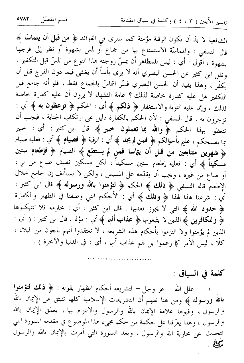الشافعية لا بد أن تكون الرقبة مؤمنة كما سنرى في الفوائد مِنْ قَبْلِ أَنْ يَتَمَاسَّا قال النسفي: والمماسة الاستمتاع بها من جماع أو لمس بشهوة أو نظر إلى فرجها بشهوة، أقول: أي: ليس للمظاهر أن يمس زوجته هذا النوع من المس قبل التكفير، ونقل ابن كثير عن الحسن البصري أنه لا يرى بأسا أن يغشى فيما دون الفرج قبل أن يكفر، وهذا يفيد أن الحسن البصري فسر التماس بالجماع فقط، فلو أنه جامع قبل التكفير هل عليه كفارة خاصة لذلك؟ عامة الفقهاء لا يرون أن عليه كفارة خاصة لذلك، وإنما عليه التوبة والاستغفار ذلِكُمْ أي: الحكم تُوعَظُونَ بِهِ أي: