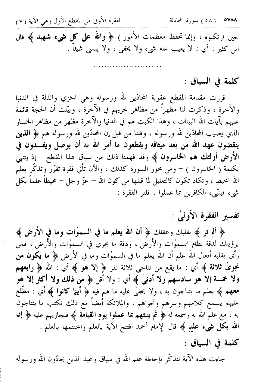 قررت مقدمة المقطع عقوبة المحادين لله ورسوله وهي الخزي والذلة في الدنيا والآخرة، وذكرت لنا مظهرا من مظاهر خزيهم في الآخرة، وبينت أن الحجة قائمة عليهم بآيات الله البينات، وهذا الكبت لهم في الدنيا والآخرة مظهر من مظاهر الخسار الذي يصيب المحادين لله ورسوله، وقلنا من قبل إن المحادين لله ورسوله هم الَّذِينَ يَنْقُضُونَ عَهْدَ اللَّهِ مِنْ بَعْدِ مِيثاقِهِ وَيَقْطَعُونَ ما أَمَرَ اللَّهُ بِهِ أَنْ يُوصَلَ وَيُفْسِدُونَ فِي الْأَرْضِ أُولئِكَ هُمُ الْخاسِرُونَ وقد فهمنا ذلك من سياق هذا المقطع- إذ ينتهي بكلمة (الخاسرون) - ومن محور السورة كذلك، والآن تأتي فقرة تقرر وتذكر بعلم الله المحيط، وتكاد تكون كالتعليل لما قبلها من كون الله- عزّ وجل- محيطا علما بكل شئ فينبئ الكافرين بما عملوا. فلنر الفقرة: