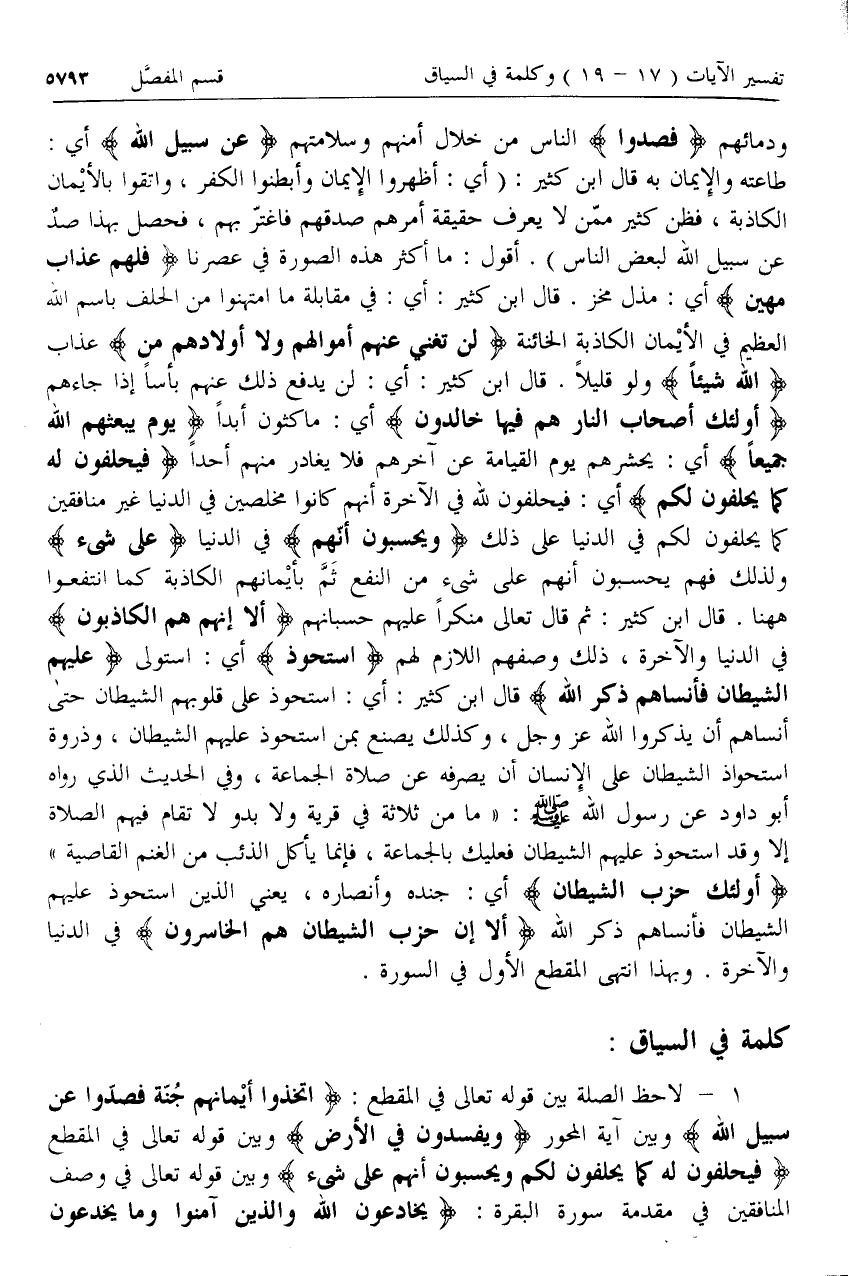 اسْتَحْوَذَ أي: استولى عَلَيْهِمُ الشَّيْطانُ فَأَنْساهُمْ ذِكْرَ اللَّهِ قال ابن كثير: أي: استحوذ على قلوبهم الشيطان حتى أنساهم أن يذكروا الله عزّ وجل، وكذلك يصنع بمن استحوذ عليهم الشيطان، وذروة استحواذ الشيطان على الإنسان أن يصرفه عن صلاة الجماعة، وفي الحديث الذي رواه أبو داود عن رسول الله صلى الله عليه وسلم: «ما من ثلاثة في قرية ولا بدو لا تقام فيهم الصلاة إلا وقد استحوذ عليهم الشيطان فعليك بالجماعة، فإنما يأكل الذئب من الغنم القاصية» أُولئِكَ حِزْبُ الشَّيْطانِ أي: جنده وأنصاره، يعني الذين استحوذ عليهم الشيطان فأنساهم ذكر الله أَلا إِنَّ حِزْبَ الشَّيْطانِ هُمُ الْخاسِرُونَ في الدنيا والآخرة. وبهذا انتهى المقطع الأول في السورة.