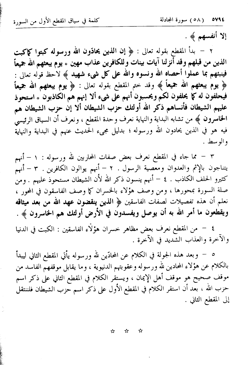3 - مما جاء في المقطع نعرف بعض صفات المحاربين لله ورسوله: 1 - أنهم يتناجون بالإثم والعدوان ومعصية الرسول. 2 - أنهم يوالون الكافرين. 3 - أنهم كثير والحلف الكاذب. 4 - أنهم ينسون ذكر الله لأن الشيطان مستحوذ عليهم. ومن صلة السورة بمحورها، ومن وصف هؤلاء بالخسران كما وصف الفاسقون في المحور، نعلم أن هذه تفصيلات لصفات الفاسقين الَّذِينَ يَنْقُضُونَ عَهْدَ اللَّهِ مِنْ بَعْدِ مِيثاقِهِ وَيَقْطَعُونَ ما أَمَرَ اللَّهُ بِهِ أَنْ يُوصَلَ وَيُفْسِدُونَ فِي الْأَرْضِ أُولئِكَ هُمُ الْخاسِرُونَ.