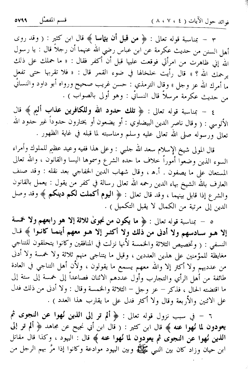 5 - بمناسبة قوله تعالى: ما يَكُونُ مِنْ نَجْوى ثَلاثَةٍ إِلَّا هُوَ رابِعُهُمْ وَلا خَمْسَةٍ إِلَّا هُوَ سادِسُهُمْ وَلا أَدْنى مِنْ ذلِكَ وَلا أَكْثَرَ إِلَّا هُوَ مَعَهُمْ أَيْنَ ما كانُوا قال النسفي: (وتخصيص الثلاثة والخمسة لأنها نزلت في المنافقين وكانوا يتحلقون للتناجي مغايظة للمؤمنين على هذين العددين، وقيل ما يتناجى منهم ثلاثة ولا خمسة ولا أدنى من عدديهم ولا أكثر إلا والله معهم يسمع ما يقولون، ولأن أهل التناجي في العادة طائفة من أهل الرأي والتجارب وأول عددهم الاثنان فصاعدا إلى خمسة إلى ستة إلى ما اقتضته الحال، فذكر- عزّ وجل- الثلاثة والخمسة وقال: ولا أدنى من ذلك فدل على الاثنين والأربعة وقال ولا أكثر فدل على ما يقارب هذا العدد).