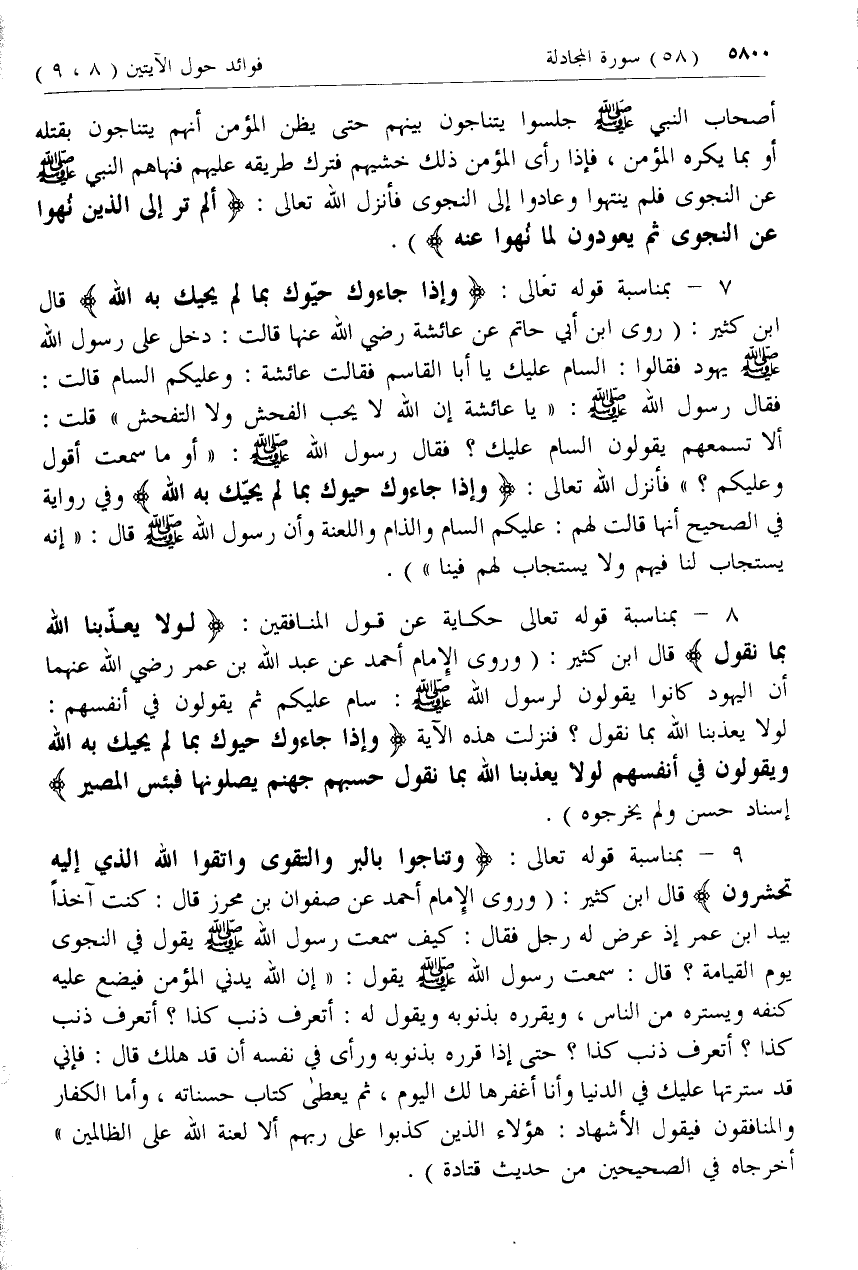 8 - بمناسبة قوله تعالى حكاية عن قول المنافقين: لَوْلا يُعَذِّبُنَا اللَّهُ بِما نَقُولُ قال ابن كثير: (وروى الإمام أحمد عن عبد الله بن عمر رضي الله عنهما أن اليهود كانوا يقولون لرسول الله صلى الله عليه وسلم: سام عليكم ثم يقولون في أنفسهم: