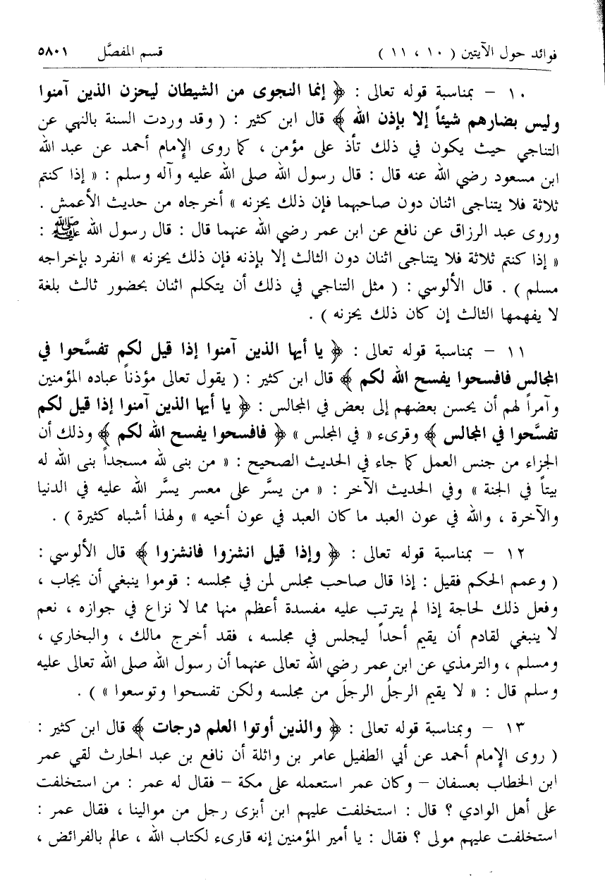 10 - بمناسبة قوله تعالى: إِنَّمَا النَّجْوى مِنَ الشَّيْطانِ لِيَحْزُنَ الَّذِينَ آمَنُوا وَلَيْسَ بِضارِّهِمْ شَيْئاً إِلَّا بِإِذْنِ اللَّهِ قال ابن كثير: (وقد وردت السنة بالنهي عن التناجي حيث يكون في ذلك تأذ على مؤمن، كما روى الإمام أحمد عن عبد الله ابن مسعود رضي الله عنه قال: قال رسول الله صلى الله عليه وآله وسلم: «إذا كنتم ثلاثة فلا يتناجى اثنان دون صاحبهما فإن ذلك يحزنه» أخرجاه من حديث الأعمش.