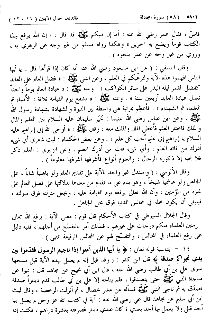 وقال الجلال السيوطي في كتاب الأحكام قال قوم: معنى الآية: يرفع الله تعالى المؤمنين العلماء منكم درجات على غيرهم، فلذلك أمر بالتفسح من أجلهم، ففيه دليل على رفع العلماء في المجالس، والتفسح لهم عن المجالس الرفيعة انتهى).