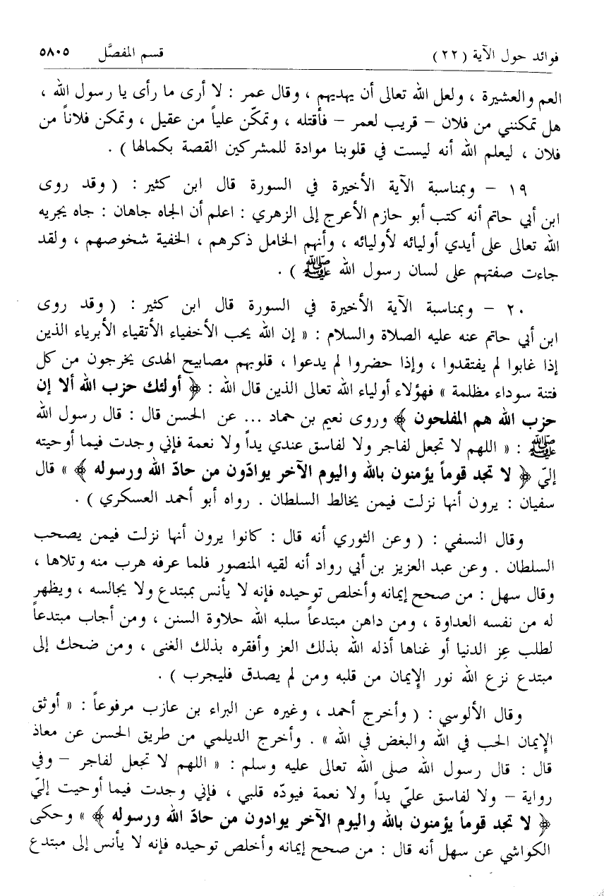 20 - وبمناسبة الآية الأخيرة في السورة قال ابن كثير: (وقد روى ابن أبي حاتم عنه عليه الصلاة والسلام: «إن الله يحب الأخفياء الأتقياء الأبرياء الذين إذا غابوا لم يفتقدوا، وإذا حضروا لم يدعوا، قلوبهم مصابيح الهدى يخرجون من كل فتنة سوداء مظلمة» فهؤلاء أولياء الله تعالى الذين قال الله: أُولئِكَ حِزْبُ اللَّهِ أَلا إِنَّ حِزْبَ اللَّهِ هُمُ الْمُفْلِحُونَ وروى نعيم بن حماد ... عن الحسن قال: قال رسول الله صلى الله عليه وسلم: «اللهم لا تجعل لفاجر ولا لفاسق عندي يدا ولا نعمة فإني وجدت فيما أو حيته إلي لا تَجِدُ قَوْماً يُؤْمِنُونَ بِاللَّهِ وَالْيَوْمِ الْآخِرِ يُوادُّونَ مَنْ حَادَّ اللَّهَ وَرَسُولَهُ» قال سفيان: يرون أنها نزلت فيمن يخالط السلطان. رواه أبو أحمد العسكري).