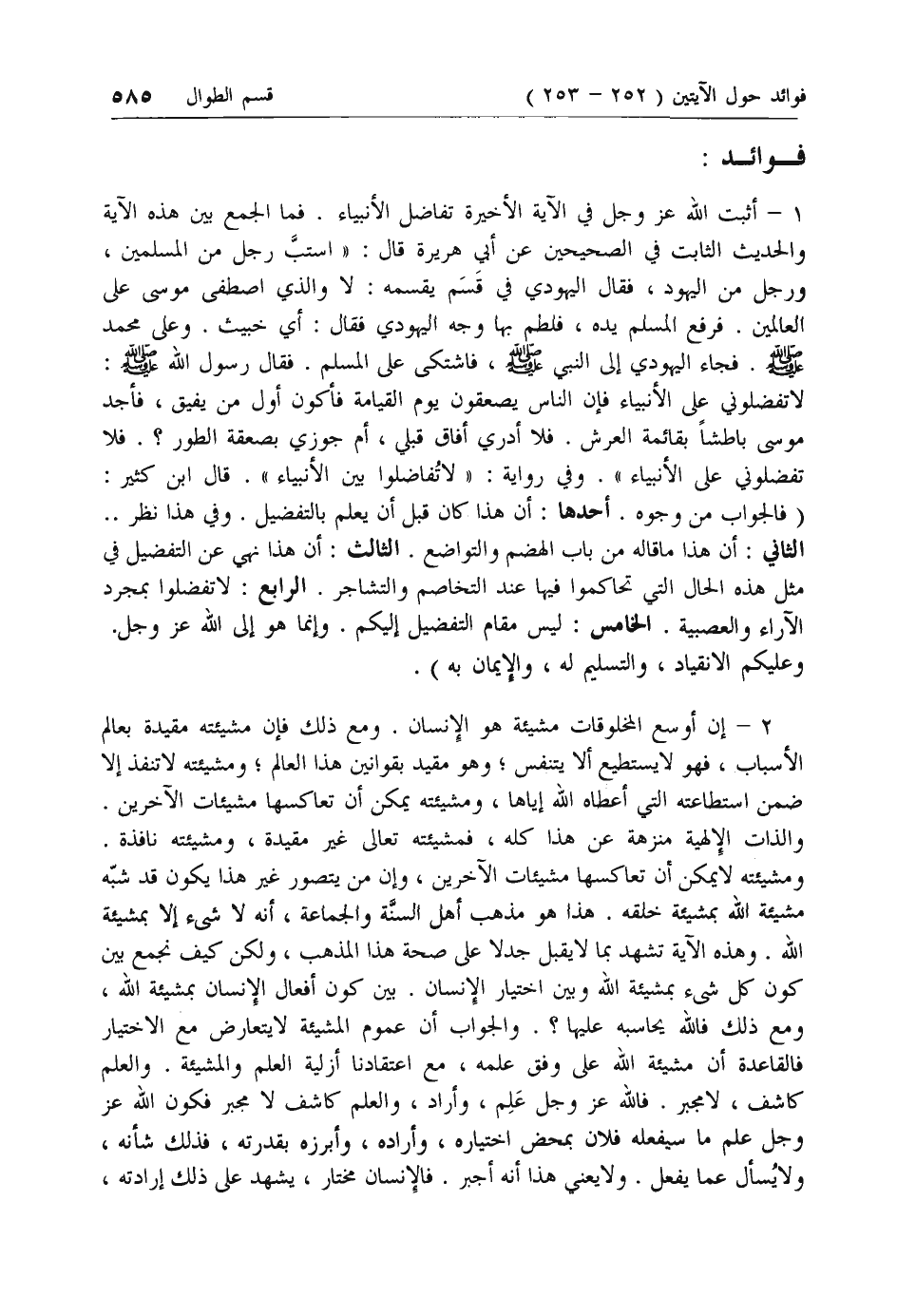 1 - أثبت الله عزّ وجل في الآية الأخيرة تفاضل الأنبياء. فما الجمع بين هذه الآية والحديث الثابت في الصحيحين عن أبي هريرة قال: «استب رجل من المسلمين، ورجل من اليهود، فقال اليهودي في قسم يقسمه: لا والذي اصطفى موسى على العالمين. فرفع المسلم يده، فلطم بها وجه اليهودي فقال: أي خبيث. وعلى محمد صلى الله عليه وسلم. فجاء اليهودي إلى النبي صلى الله عليه وسلم، فاشتكى على المسلم. فقال رسول الله صلى الله عليه وسلم: