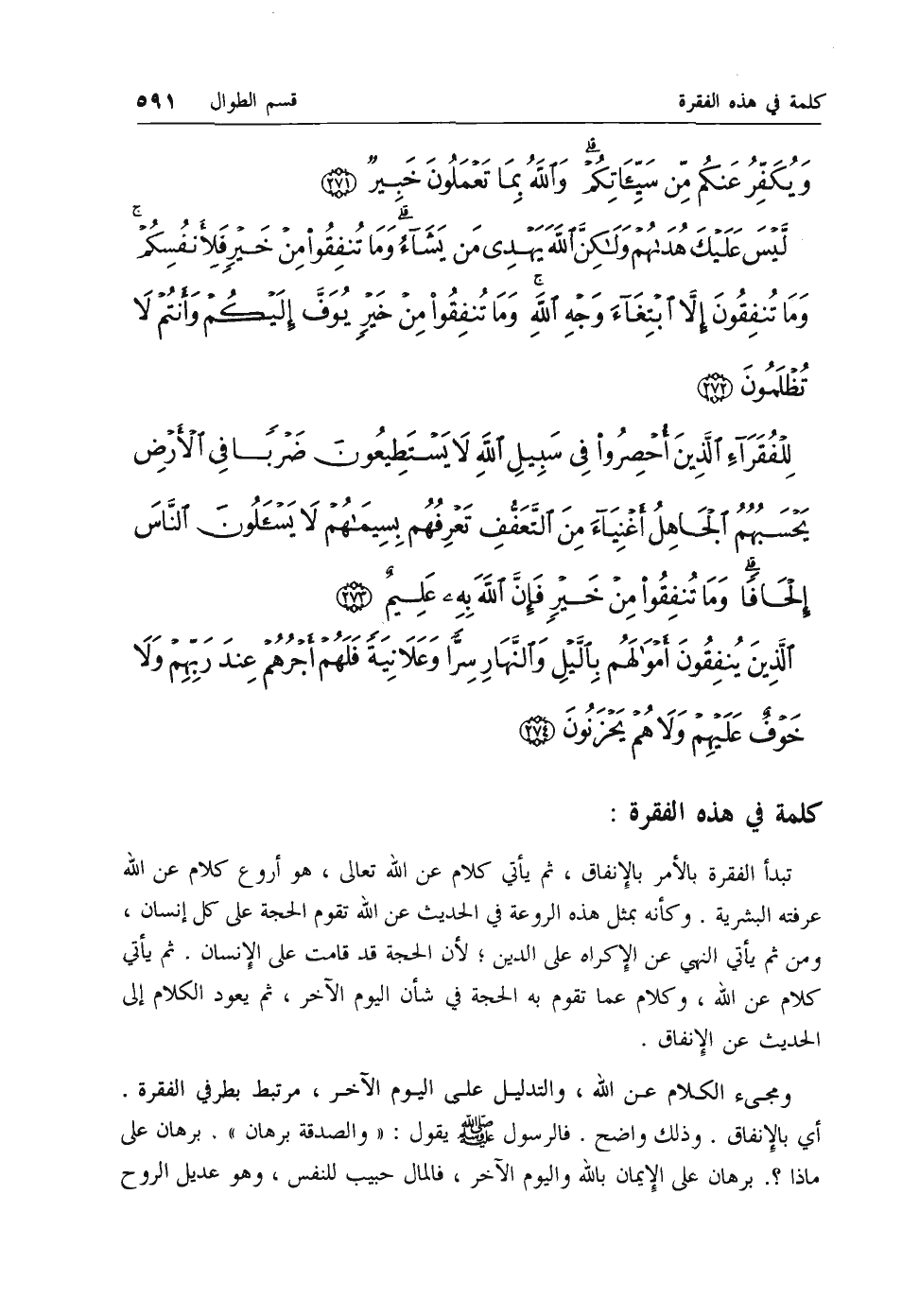 تبدأ الفقرة بالأمر بالإنفاق، ثم يأتي كلام عن الله تعالى، هو أروع كلام عن الله عرفته البشرية. وكأنه بمثل هذه الروعة في الحديث عن الله تقوم الحجة على كل إنسان، ومن ثم يأتي النهي عن الإكراه على الدين؛ لأن الحجة قد قامت على الإنسان. ثم يأتي كلام عن الله، وكلام عما تقوم به الحجة في شأن اليوم الآخر، ثم يعود الكلام إلى الحديث عن الإنفاق.
