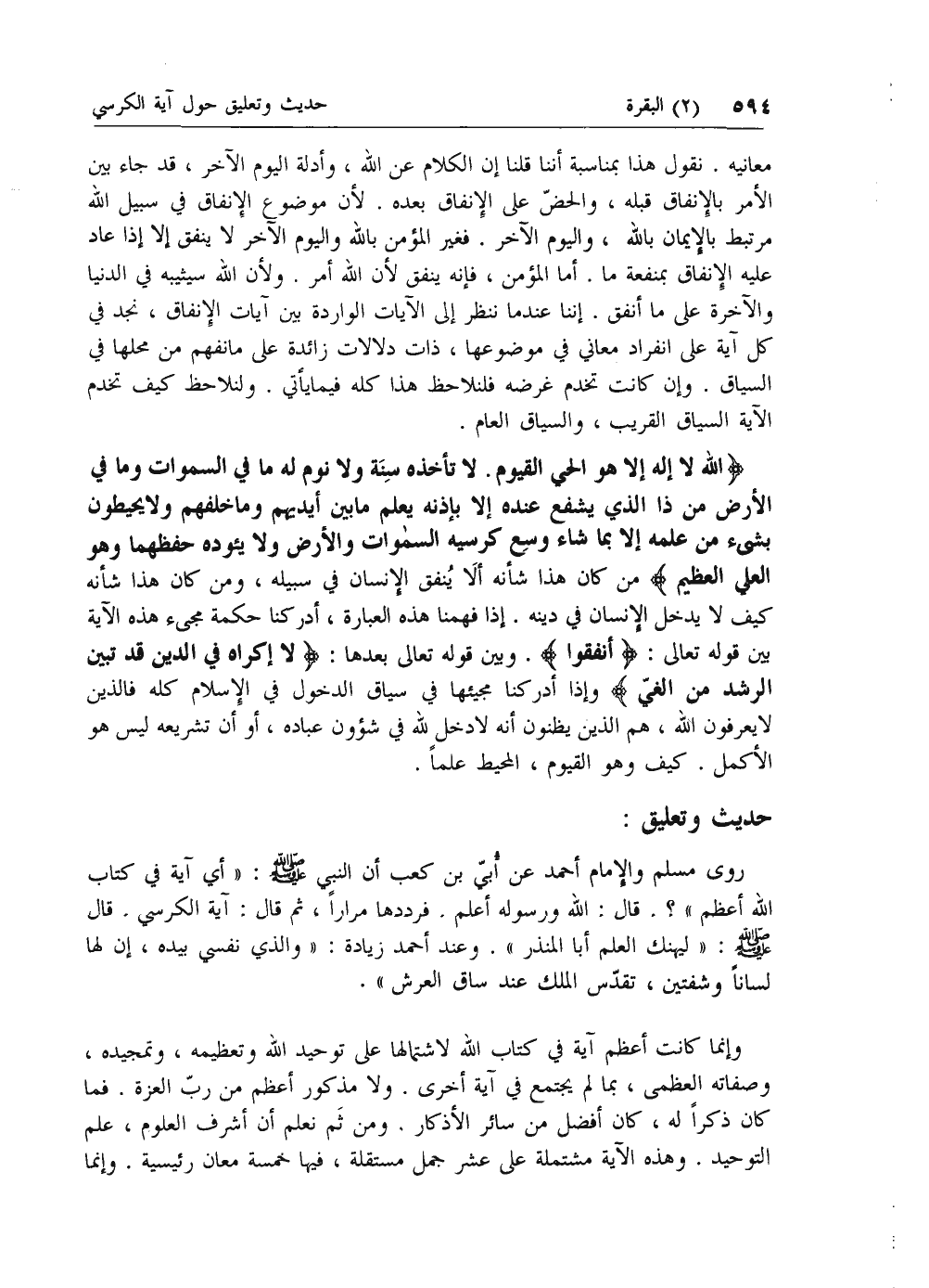 معانيه. نقول هذا بمناسبة أننا قلنا إن الكلام عن الله، وأدلة اليوم الآخر، قد جاء بين الأمر بالإنفاق قبله، والحض على الإنفاق بعده. لأن موضوع الإنفاق في سبيل الله مرتبط بالإيمان بالله، واليوم الآخر. فغير المؤمن بالله واليوم الآخر لا ينفق إلا إذا عاد عليه الإنفاق بمنفعة ما. أما المؤمن، فإنه ينفق لأن الله أمر. ولأن الله سيثيبه في الدنيا والآخرة على ما أنفق. إننا عند ما ننظر إلى الآيات الواردة بين آيات الإنفاق، نجد في كل آية على انفراد معاني في موضوعها، ذات دلالات زائدة على ما نفهم من محلها في السياق. وإن كانت تخدم غرضه فلنلاحظ هذا كله فيما يأتي. ولنلاحظ كيف تخدم الآية السياق القريب، والسياق العام.