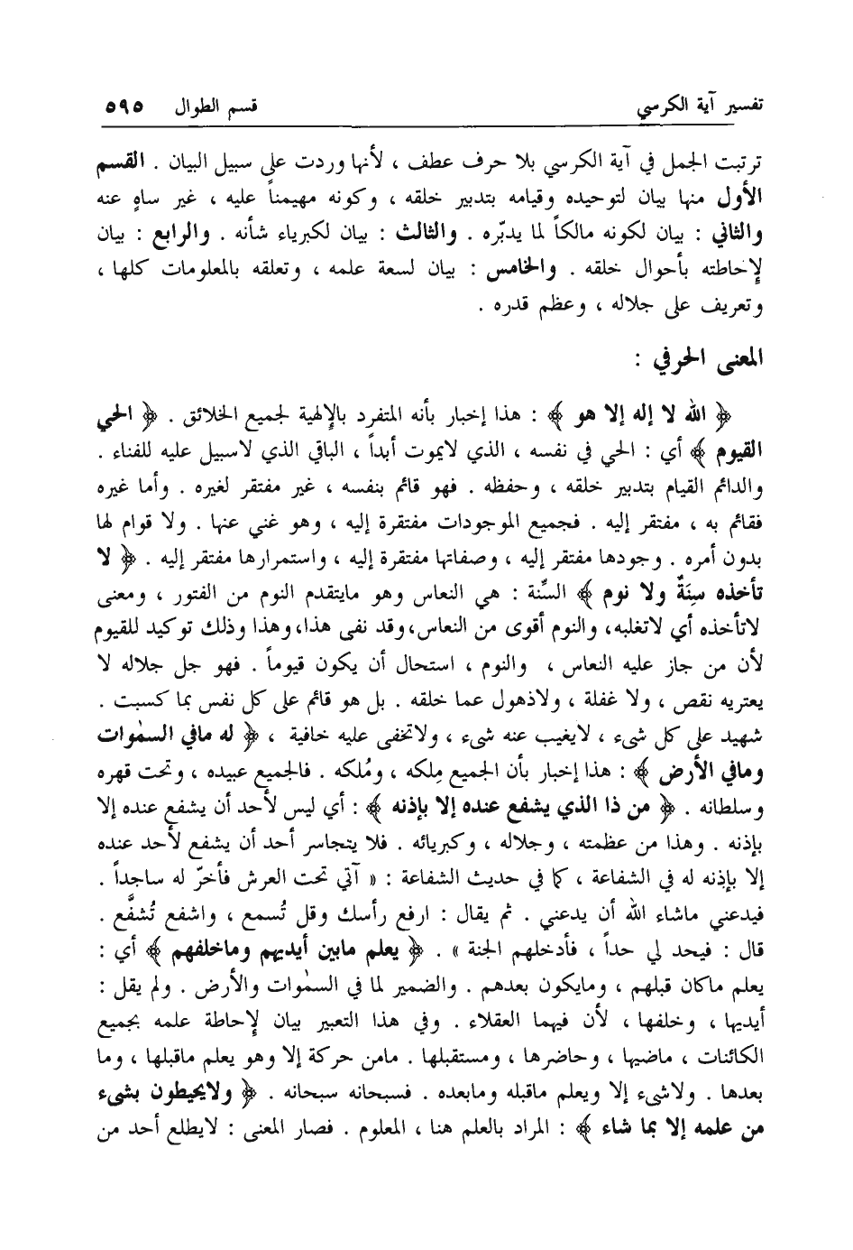 ترتبت الجمل في آية الكرسي بلا حرف عطف، لأنها وردت على سبيل البيان. القسم الأول منها بيان لتوحيده وقيامه بتدبير خلقه، وكونه مهيمنا عليه، غير ساه عنه والثاني: بيان لكونه مالكا لما يدبره. والثالث: بيان لكبرياء شأنه. والرابع: بيان لإحاطته بأحوال خلقه. والخامس: بيان لسعة علمه، وتعلقه بالمعلومات كلها، وتعريف على جلاله، وعظم قدره.