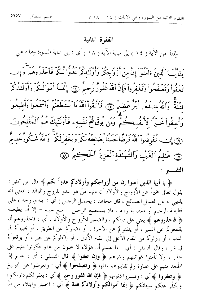 يا أَيُّهَا الَّذِينَ آمَنُوا إِنَّ مِنْ أَزْواجِكُمْ وَأَوْلادِكُمْ عَدُوًّا لَكُمْ فَاحْذَرُوهُمْ وَإِنْ تَعْفُوا وَتَصْفَحُوا وَتَغْفِرُوا فَإِنَّ اللَّهَ غَفُورٌ رَحِيمٌ (14) إِنَّما أَمْوالُكُمْ وَأَوْلادُكُمْ فِتْنَةٌ وَاللَّهُ عِنْدَهُ أَجْرٌ عَظِيمٌ (15) فَاتَّقُوا اللَّهَ مَا اسْتَطَعْتُمْ وَاسْمَعُوا وَأَطِيعُوا وَأَنْفِقُوا خَيْراً لِأَنْفُسِكُمْ وَمَنْ يُوقَ شُحَّ نَفْسِهِ فَأُولئِكَ هُمُ الْمُفْلِحُونَ (16) إِنْ تُقْرِضُوا اللَّهَ قَرْضاً حَسَناً يُضاعِفْهُ لَكُمْ وَيَغْفِرْ لَكُمْ وَاللَّهُ شَكُورٌ حَلِيمٌ (17) عالِمُ الْغَيْبِ وَالشَّهادَةِ الْعَزِيزُ الْحَكِيمُ (18)