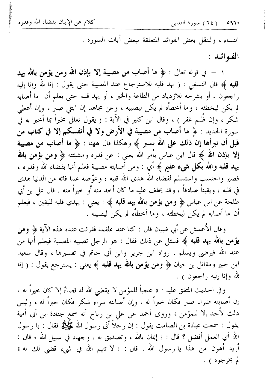 1 - في قوله تعالى: ما أَصابَ مِنْ مُصِيبَةٍ إِلَّا بِإِذْنِ اللَّهِ وَمَنْ يُؤْمِنْ بِاللَّهِ يَهْدِ قَلْبَهُ قال النسفي: (يهد قلبه للاسترجاع عند المصيبة حتى يقول: إنا لله وإنا إليه راجعون، أو يشرحه للازدياد من الطاعة والخير، أو يهد قلبه حتى يعلم أن ما أصابه لم يكن ليخطئه، وما أخطأه لم يكن ليصيبه، وعن مجاهد إن ابتلي صبر، وإن أعطي شكر، وإن ظلم غفر)، وقال ابن كثير في الآية: (يقول تعالى مخبرا بما أخبر به في سورة الحديد: ما أَصابَ مِنْ مُصِيبَةٍ فِي الْأَرْضِ وَلا فِي أَنْفُسِكُمْ إِلَّا فِي كِتابٍ مِنْ قَبْلِ أَنْ نَبْرَأَها إِنَّ ذلِكَ عَلَى اللَّهِ يَسِيرٌ وهكذا قال هاهنا: ما أَصابَ مِنْ مُصِيبَةٍ إِلَّا بِإِذْنِ اللَّهِ قال ابن عباس بأمر الله يعني: عن قدره ومشيئته وَمَنْ يُؤْمِنْ بِاللَّهِ يَهْدِ قَلْبَهُ وَاللَّهُ بِكُلِّ شَيْءٍ عَلِيمٌ أي: ومن أصابته مصيبة فعلم أنها بقضاء الله وقدره، فصبر واحتسب واستسلم لقضاء الله هدى الله قلبه، وعوضه عما فاته من الدنيا هدى في قلبه، ويقينا صادقا، وقد يخلف عليه ما كان أخذ منه أو خيرا منه. قال علي بن أبي طلحة عن ابن عباس وَمَنْ يُؤْمِنْ بِاللَّهِ يَهْدِ قَلْبَهُ: يعني: يهدي قلبه لليقين، فيعلم أن ما أصابه لم يكن ليخطئه، وما أخطأه لم يكن ليصيبه.