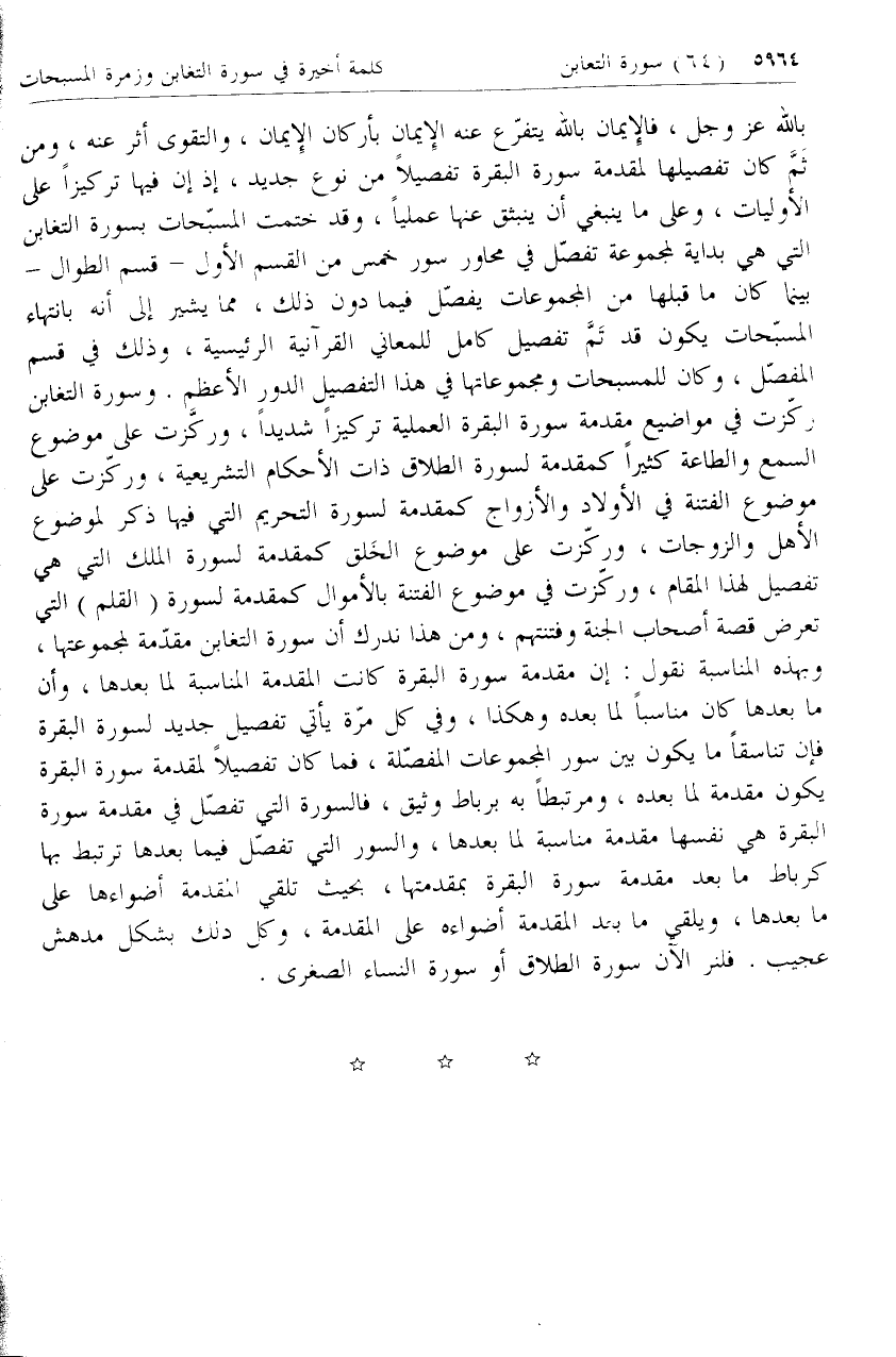 بالله عزّ وجل، فالإيمان بالله يتفرع عنه الإيمان بأركان الإيمان، والتقوى أثر عنه، ومن ثم كان تفصيلها لمقدمة سورة البقرة تفصيلا من نوع جديد، إذ إن فيها تركيزا على الأوليات، وعلى ما ينبغي أن ينبثق عنها عمليا، وقد ختمت المسبحات بسورة التغابن التي هي بداية لمجموعة تفصل في محاور سور خمس من القسم الأول- قسم الطوال- بينما كان ما قبلها من المجموعات يفصل فيما دون ذلك، مما يشير إلى أنه بانتهاء المسبحات يكون قد ثم تفصيل كامل للمعاني القرآنية الرئيسية، وذلك في قسم المفصل، وكان للمسبحات ومجموعاتها في هذا التفصيل الدور الأعظم. وسورة التغابن ركزت في مواضيع مقدمة سورة البقرة العملية تركيزا شديدا، وركزت على موضوع السمع والطاعة كثيرا كمقدمة لسورة الطلاق ذات الأحكام التشريعية، وركزت على موضوع الفتنة في الأولاد والأزواج كمقدمة لسورة التحريم التي فيها ذكر لموضوع الأهل والزوجات، وركزت على موضوع الخلق كمقدمة لسورة الملك التي هي تفصيل لهذا المقام، وركزت في موضوع الفتنة بالأموال كمقدمة لسورة (القلم) التي تعرض قصة أصحاب الجنة وفتنتهم، ومن هذا ندرك أن سورة التغابن مقدمة لمجموعتها، وبهذه المناسبة نقول: إن مقدمة سورة البقرة كانت المقدمة المناسبة لما بعدها، وأن ما بعدها كان مناسبا لما بعده وهكذا، وفي كل مرة يأتي تفصيل جديد لسورة البقرة فإن تناسقا ما يكون بين سور المجموعات المفصلة، فما كان تفصيلا لمقدمة سورة البقرة يكون مقدمة لما بعده، ومرتبطا به برباط وثيق، فالسورة التي تفصل في مقدمة سورة البقرة هي نفسها مقدمة مناسبة لما بعدها، والسور التي تفصل فيما بعدها ترتبط بها كرباط ما بعد مقدمة سورة البقرة بمقدمتها، بحيث تلقي المقدمة أضواءها على ما بعدها، ويلقي ما بعد المقدمة أضواءه على المقدمة، وكل ذلك بشكل مدهش عجيب. فلنر الآن سورة الطلاق أو سورة النساء الصغرى.