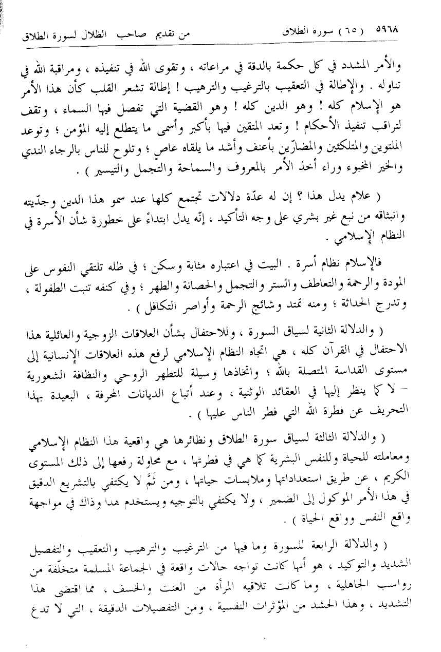 (والدلالة الثالثة لسياق سورة الطلاق ونظائرها هي واقعية هذا النظام الإسلامي ومعاملته للحياة وللنفس البشرية كما هي في فطرتها، مع محاولة رفعها إلى ذلك المستوى الكريم، عن طريق استعداداتها وملابسات حياتها، ومن ثم لا يكتفي بالتشريع الدقيق في هذا الأمر الموكول إلى الضمير، ولا يكتفي بالتوجيه ويستخدم هذا وذاك في مواجهة واقع النفس وواقع الحياة).