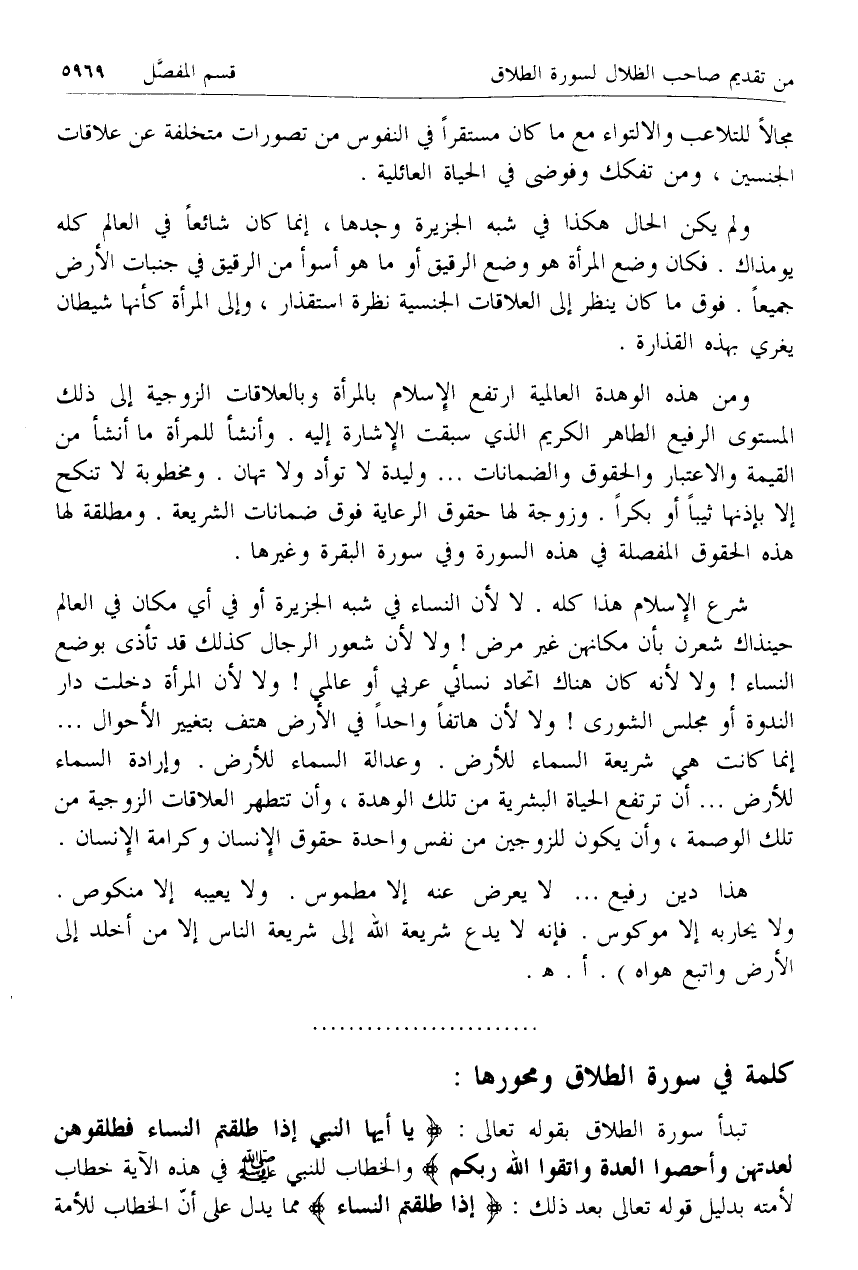 إنما كانت هي شريعة السماء للأرض. وعدالة السماء للأرض. وإرادة السماء للأرض ... أن ترتفع الحياة البشرية من تلك الوهدة، وأن تتطهر العلاقات الزوجية من تلك الوصمة، وأن يكون للزوجين من نفس واحدة حقوق الإنسان وكرامة الإنسان.